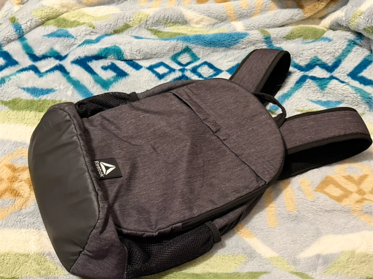 A practical grey backpack from Reebok. It features a main zippered compartment and a front pocket. Mesh pockets are on the sides. This bag is good for everyday use or for gym essentials.
