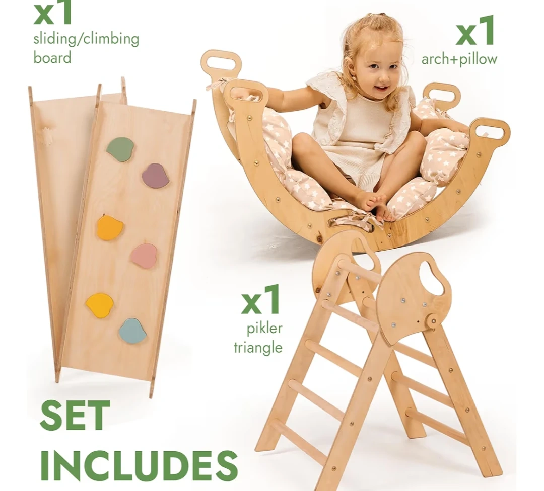 This Kidventures set includes a climbing triangle, a rocking arch with pillow, and a sliding/climbing board. It's made from wood and is suitable for active play. This set offers multiple ways for kids to climb, slide, and rock!