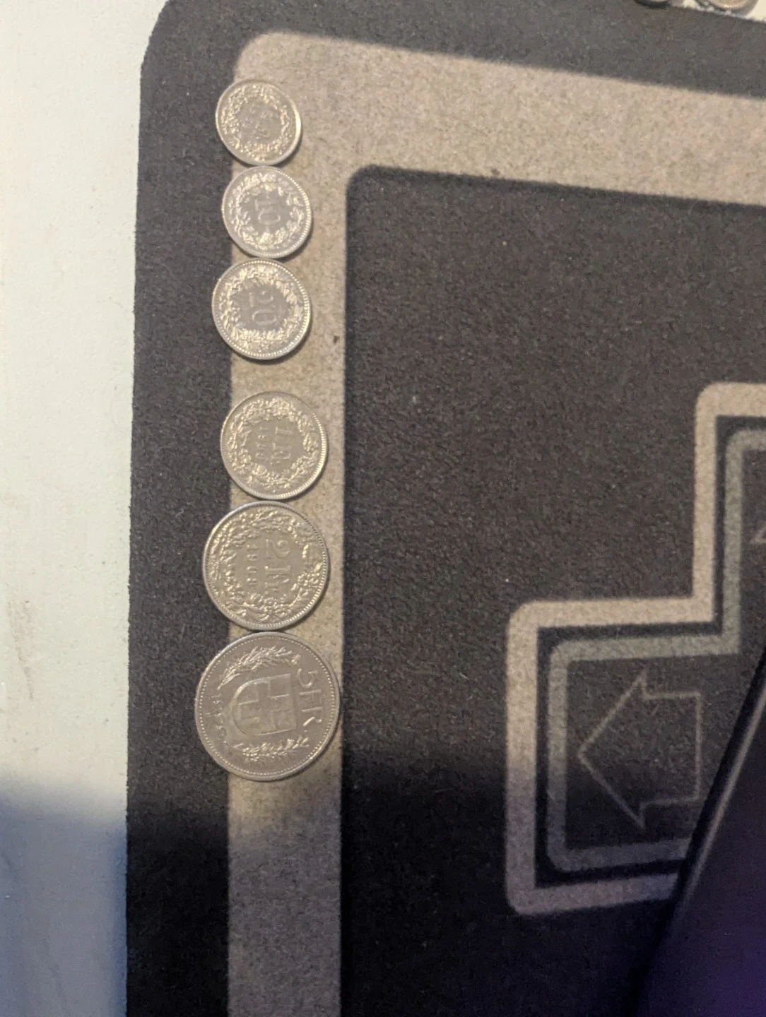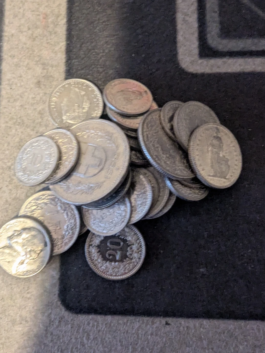 Collection of various Swiss Franc coins, including denominations of 10, 20, and 50 cents, as well as a 5 Franc coin. These coins are made from metal and feature detailed engravings. Perfect for coin collectors or anyone interested in Swiss currency. Over 30 francs the value in Canada for 33 Swiss franc is (57.49) taking offers