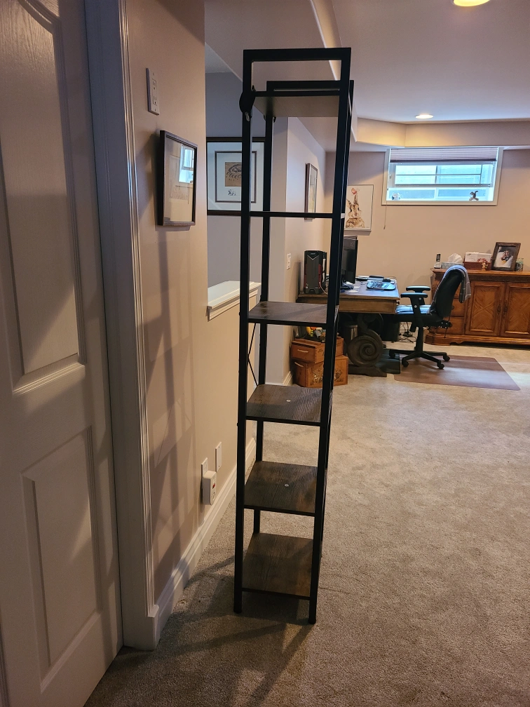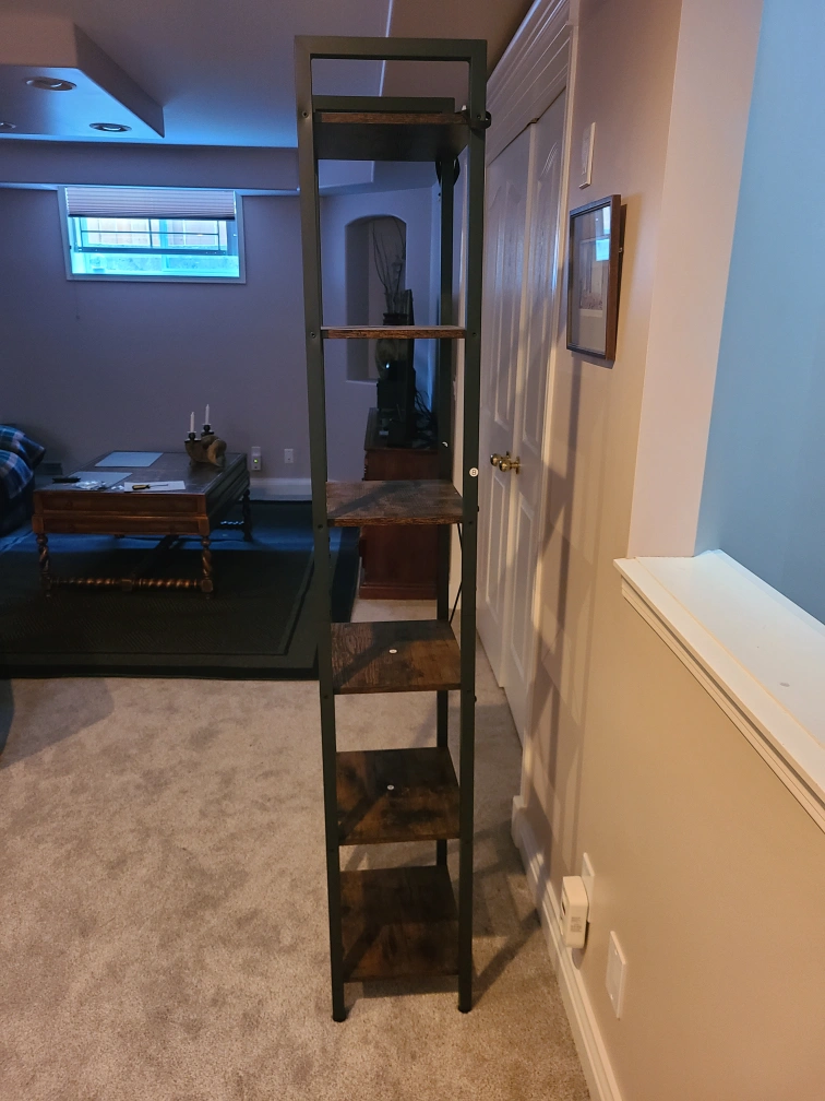 This is a ladder shelf bookcase with 6 tiers. It's great for displaying books, plants, or other decorative items. The shelves are made of wood and the frame is metal. It is in great condition and ready for a new home
