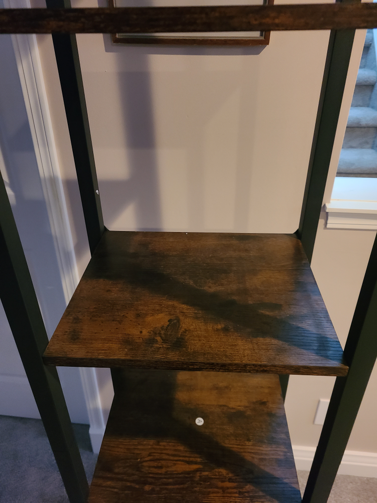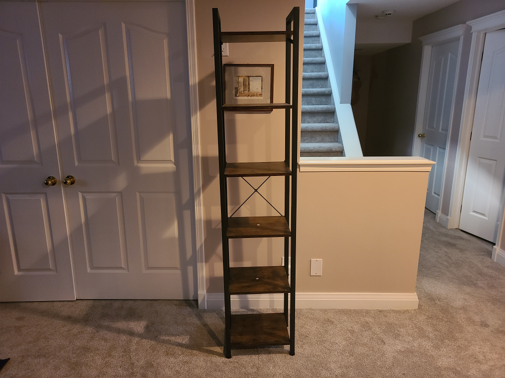 This is a ladder shelf bookcase with 6 tiers. It's great for displaying books, plants, or other decorative items. The shelves are made of wood and the frame is metal. It is in great condition and ready for a new home