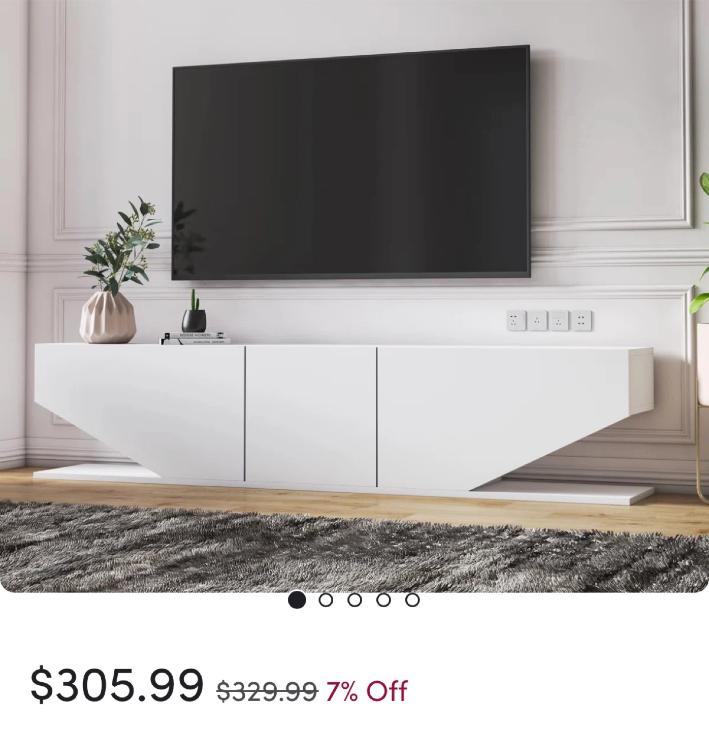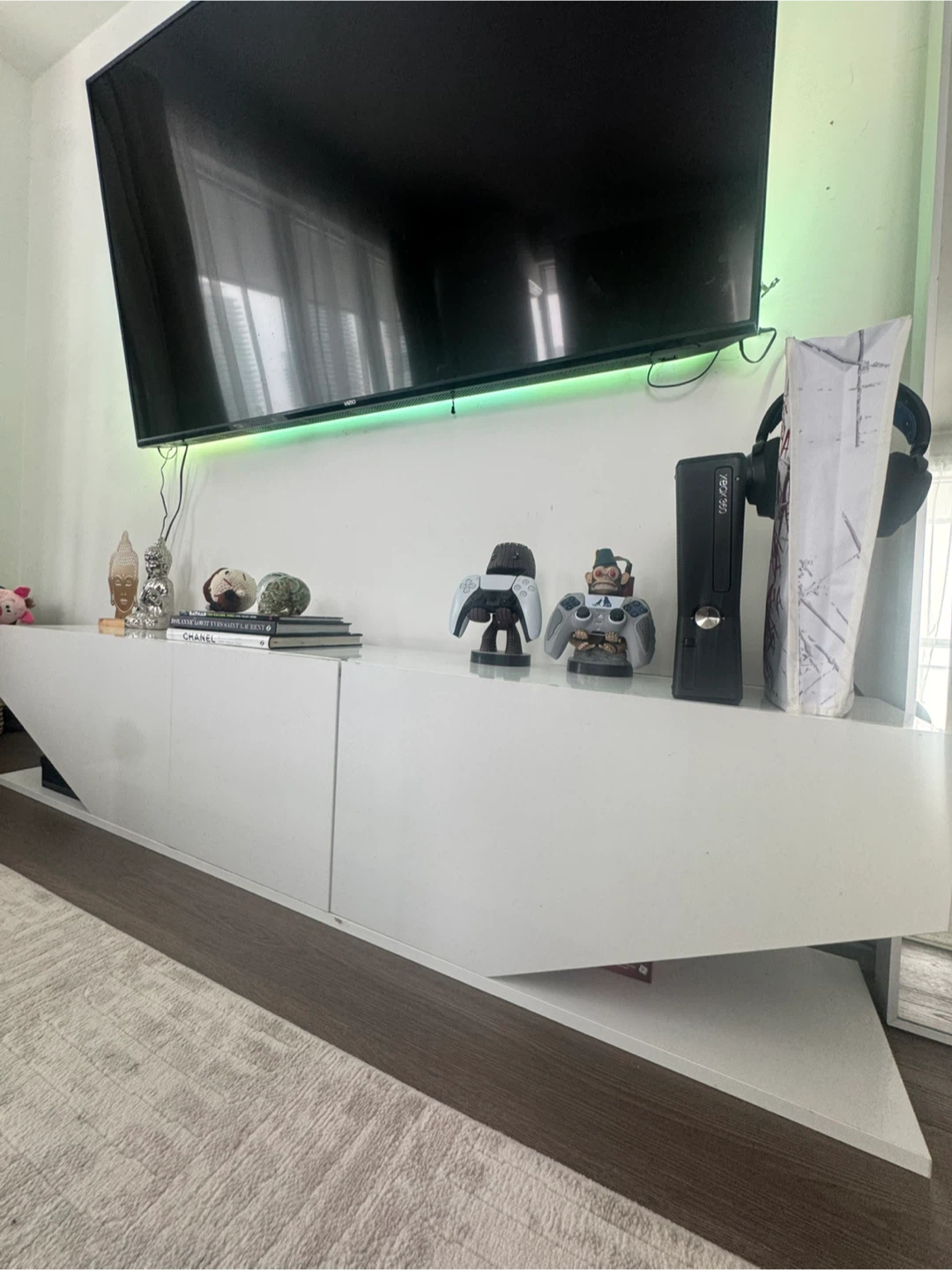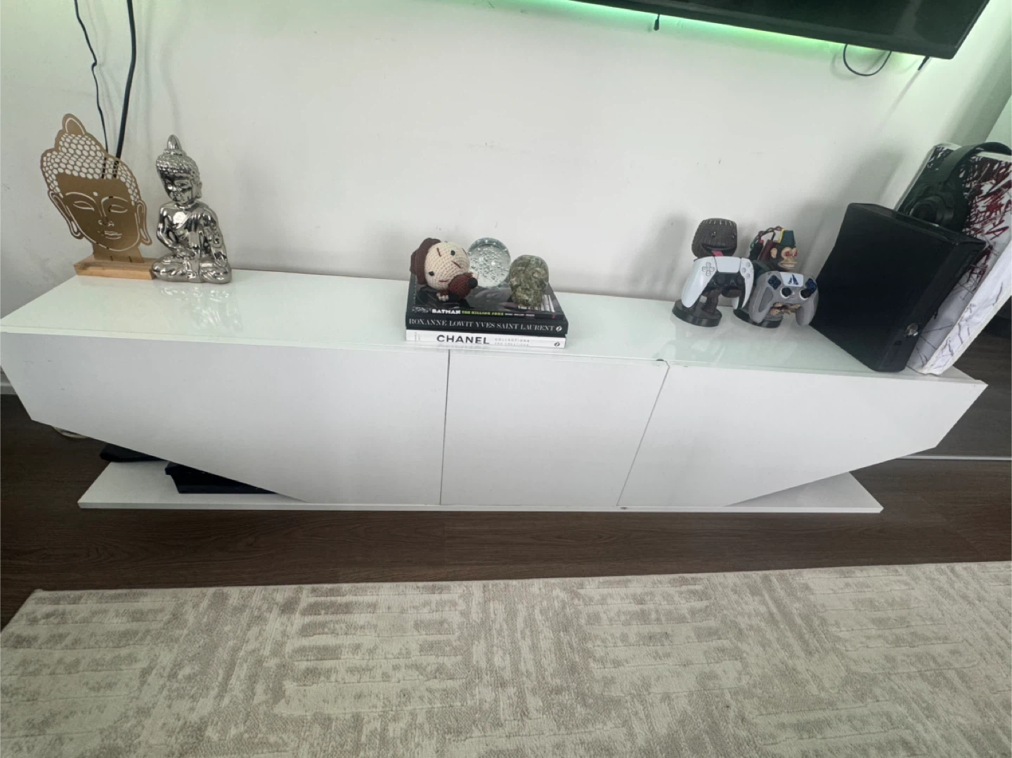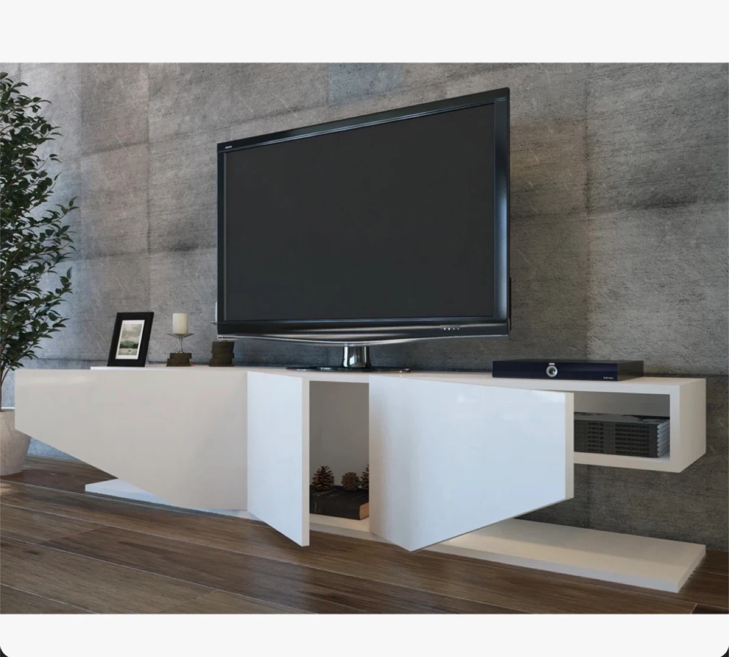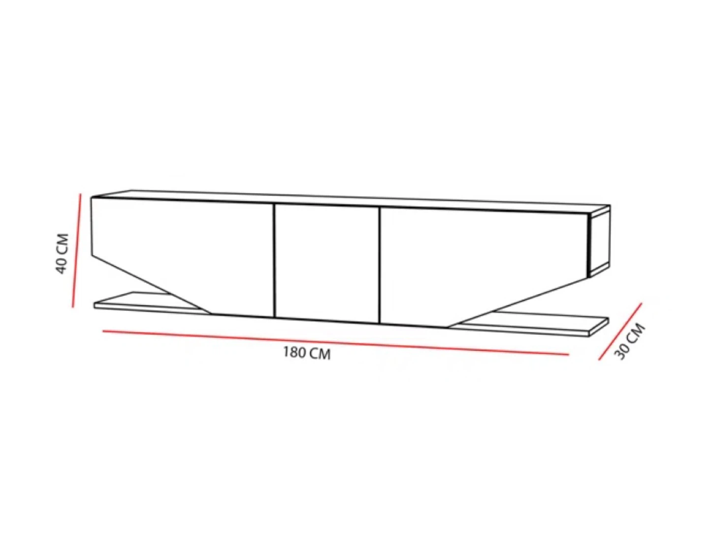 A white modern TV stand with a sleek, angular design. Its dimensions are 180cm in length, 40cm in height, and 30cm in depth. Plenty of storage space for your media needs!