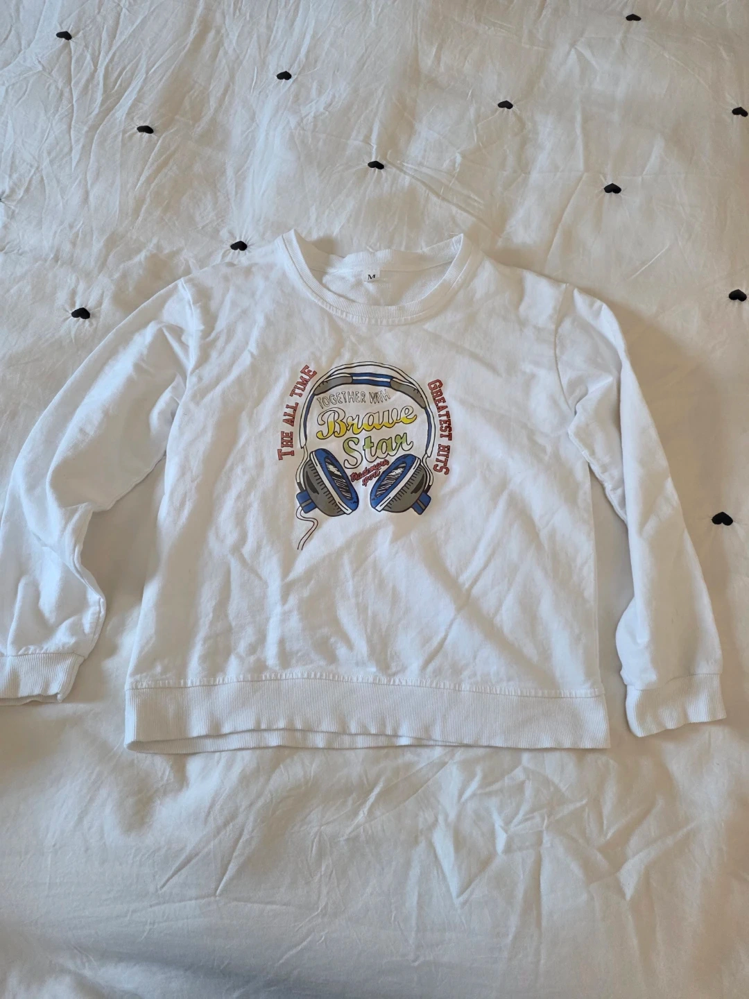 This is a white long-sleeved shirt with a graphic featuring headphones and the text "Together with Brave Star Greatest Hits The All Time". It's size medium. Cotton material.