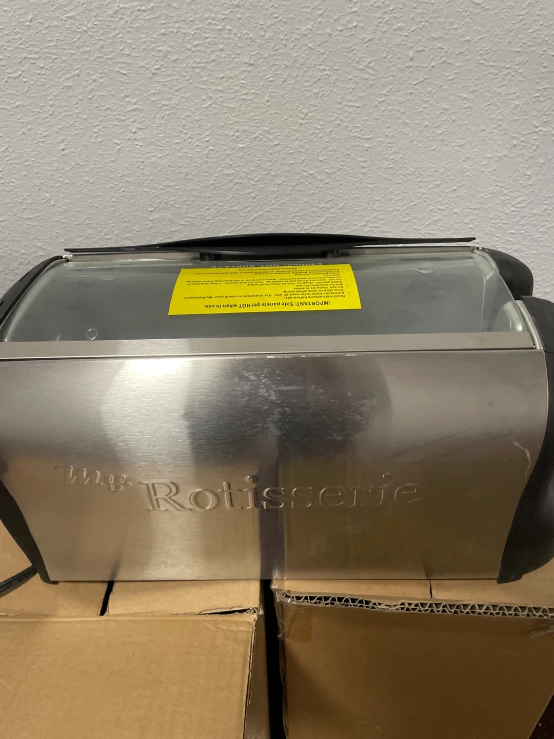 This is a Tasti-Chef The Rotisserie. It's a countertop rotisserie oven with a glass door and a rotating spit. It includes the spit and handle.