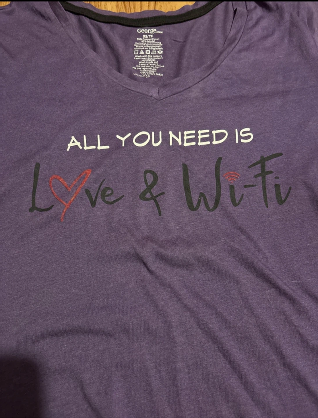 This is a gently used George purple t-shirt, perfect for casual wear. It features a v-neck and a fun print that says, "All you need is love & wifi". The shirt is in good condition and ready for a new home!