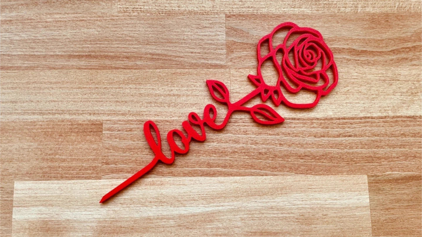 This is a red rose cake topper with the word "love" on the stem. It's perfect for adding a decorative touch to cakes for special occasions. Ideal for Valentine's Day or anniversaries!
