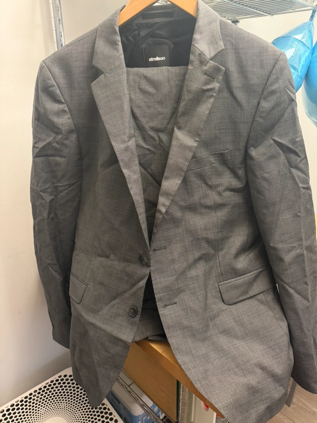Strellson slim cut suit, in good condition just needs a good clean and press. One belt loop is torn (see photo) but otherwise is in good condition. Can’t remember/find the size, but it was worn by someone who is 6’ tall, ~175lb. Free to anyone who might need it!