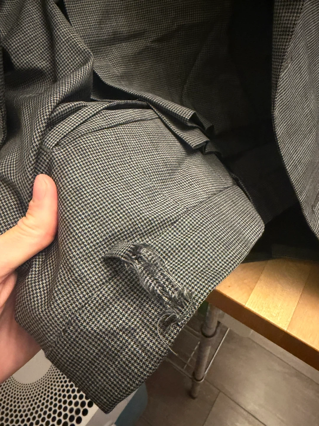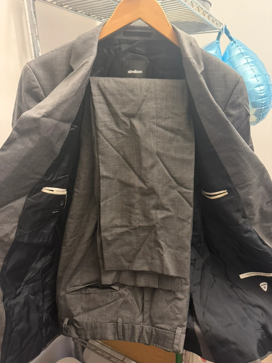 Strellson slim cut suit, in good condition just needs a good clean and press. One belt loop is torn (see photo) but otherwise is in good condition. Can’t remember/find the size, but it was worn by someone who is 6’ tall, ~175lb. Free to anyone who might need it!