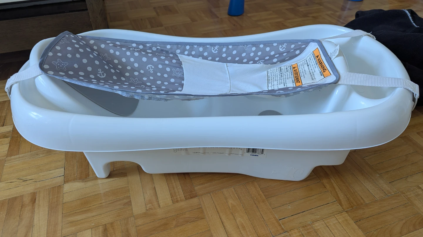 baby bath tub with a grey and white anchor and polka dot sling. It has a built-in infant support. The sling is removable for older babies. It's suitable for newborns and up to 11 kg.