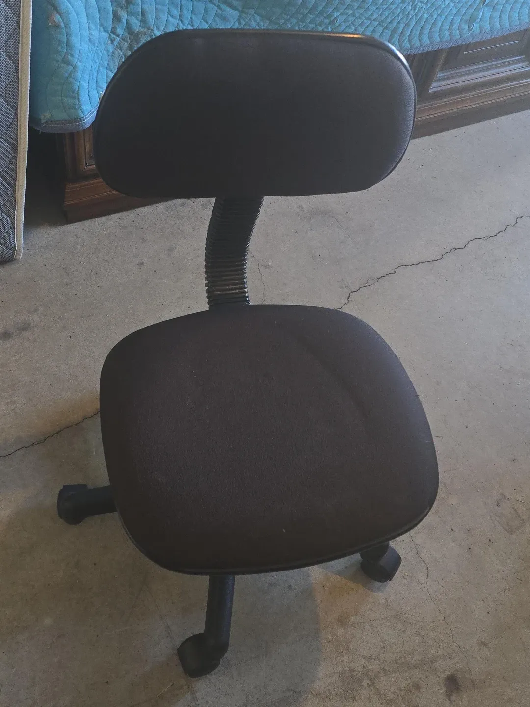 This is a black swivel office chair with a flexible back support. It's built with a fabric upholstery for comfort. The chair's height is adjustable. It's a good option for a home office setup.