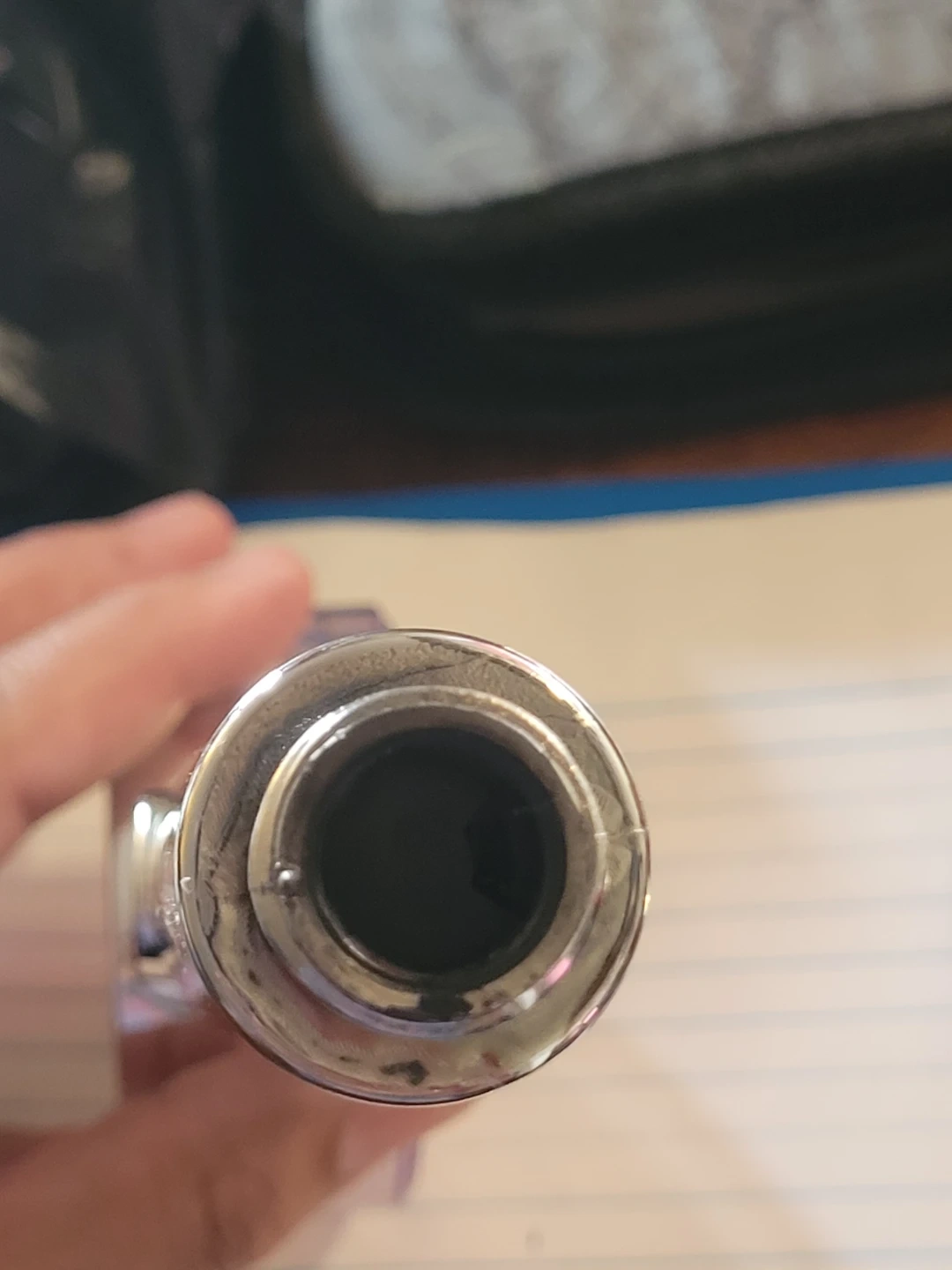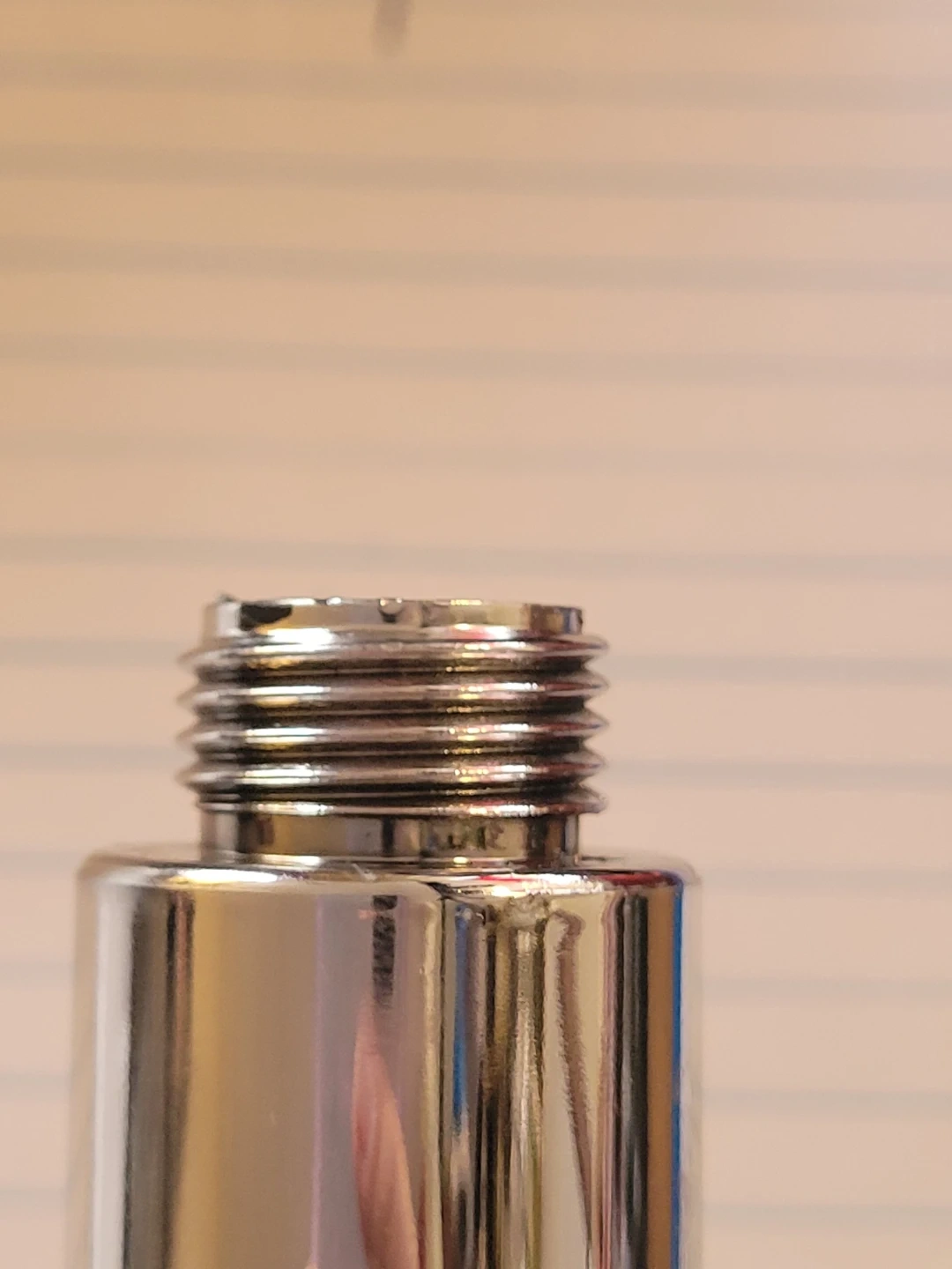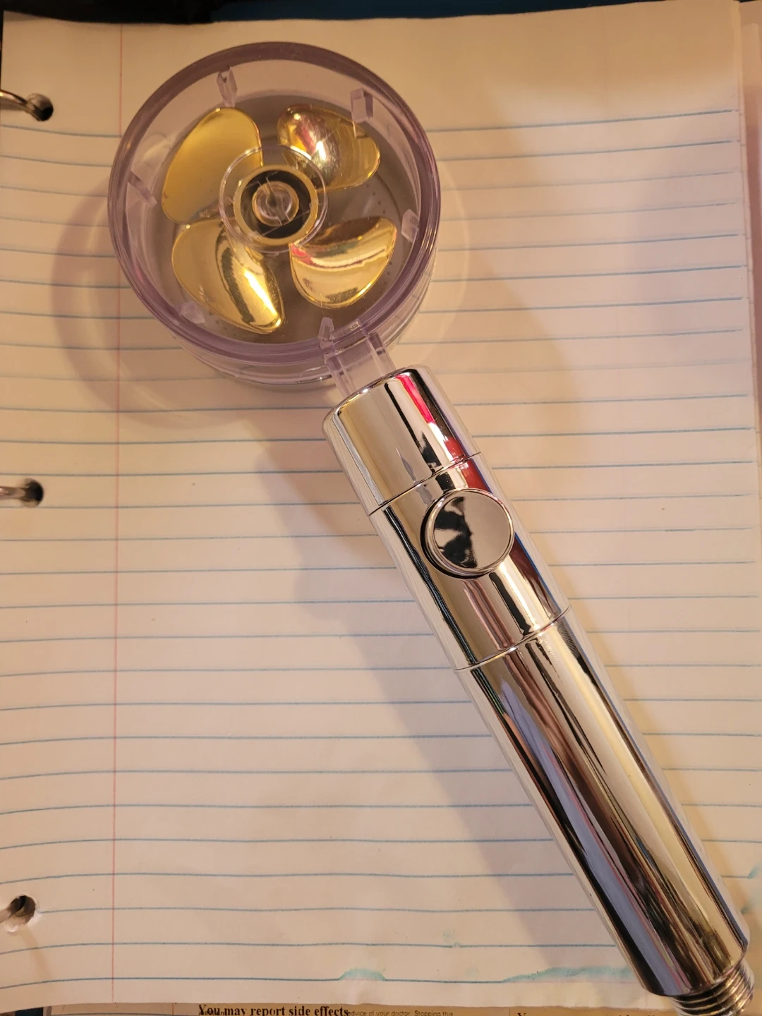 This is a handheld shower head with a built-in on/off pause button. It features a chrome finish and a clear plastic housing with gold-colored fan blades. It's a standard bathroom fixture.