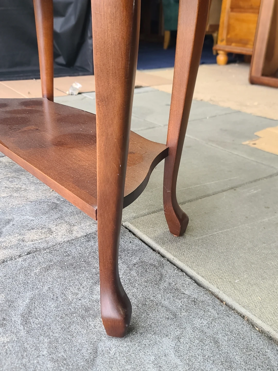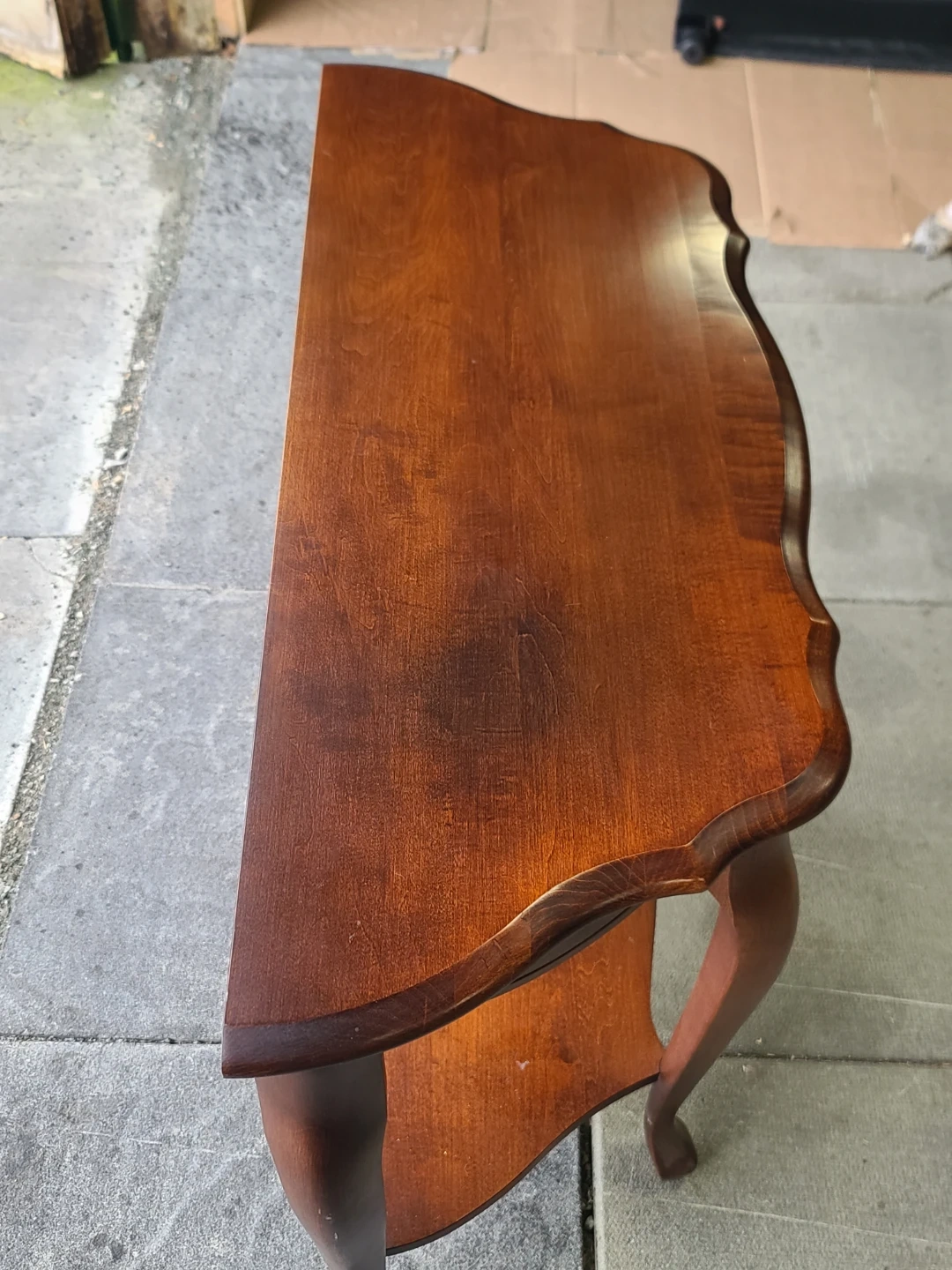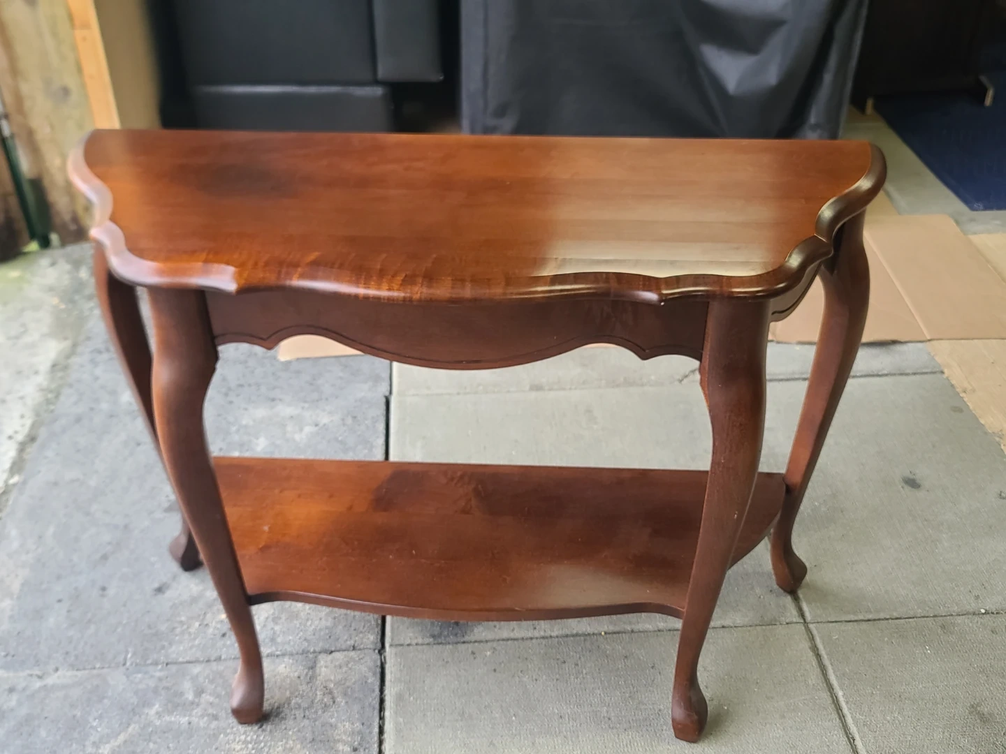 A classic wooden console table featuring elegant curved legs and a lower shelf for extra storage. It's crafted from solid wood with a warm, rich finish. Perfect for an entryway or living room. Measurements to follow. Delivery can be arranged. Viewing and pickup by appointment.