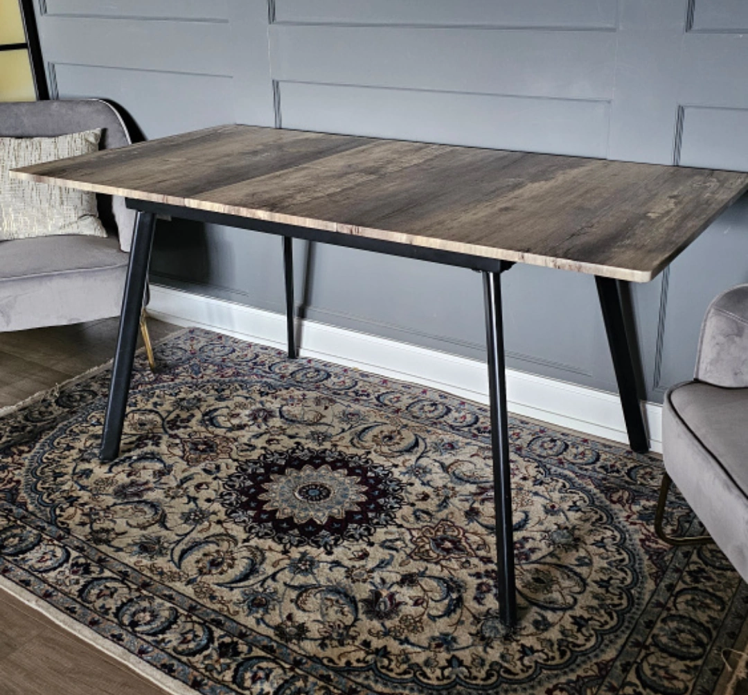 A grey wood grain dining table in great condition that has durable metal legs with a black finish. Easily fit four chairs around this table or pull apart the top to reveal a built-in butterfly leaf for extra seating space.