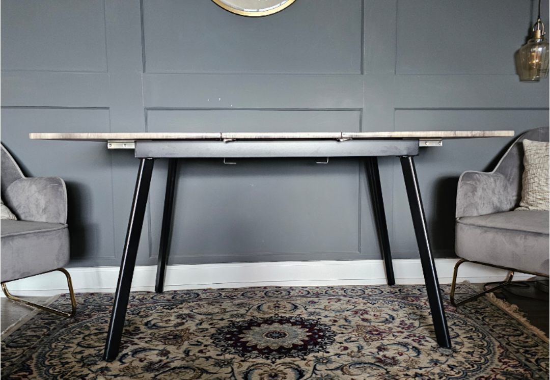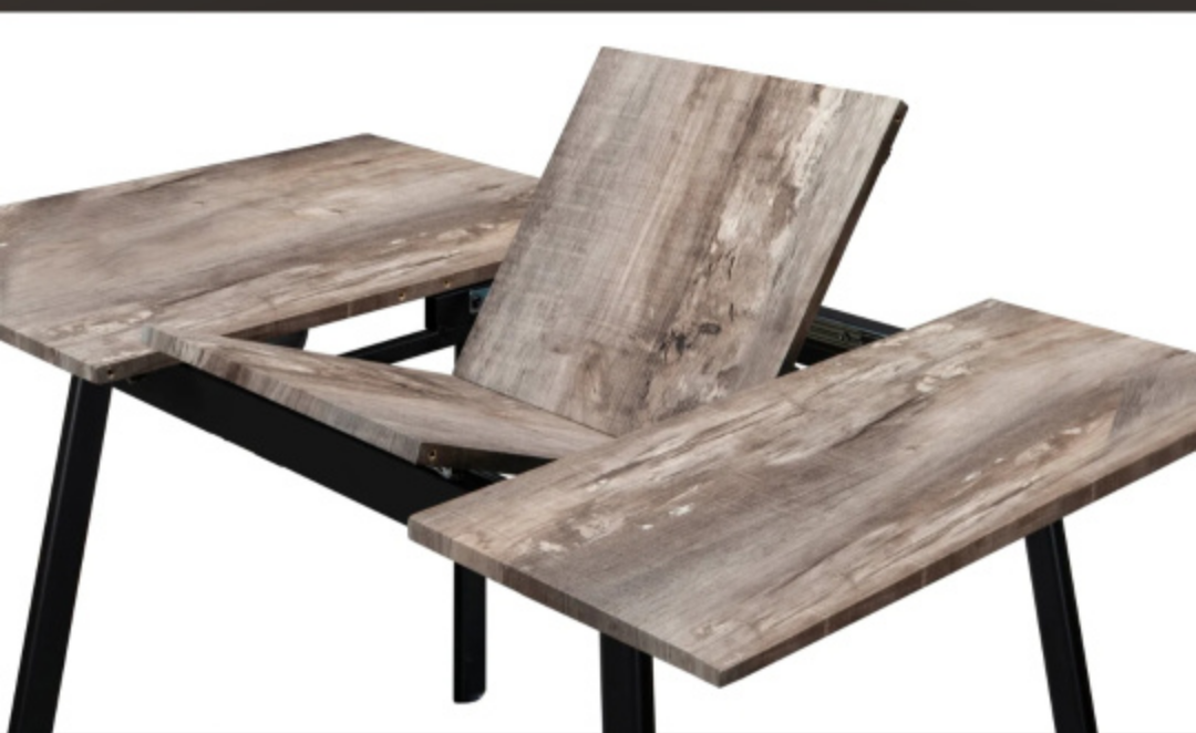 A grey wood grain dining table in great condition that has durable metal legs with a black finish. Easily fit four chairs around this table or pull apart the top to reveal a built-in butterfly leaf for extra seating space.
