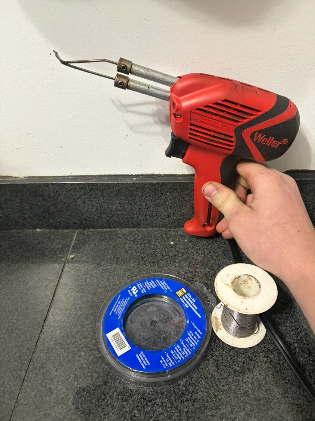 This is a Weller soldering gun and a spool of solder. The solder is 1/4 lb, 0.031 inch diameter, lead-free tin/silver/copper. Temperature rating is 70 to 125°C. It's suitable for electronics repair and DIY projects.
