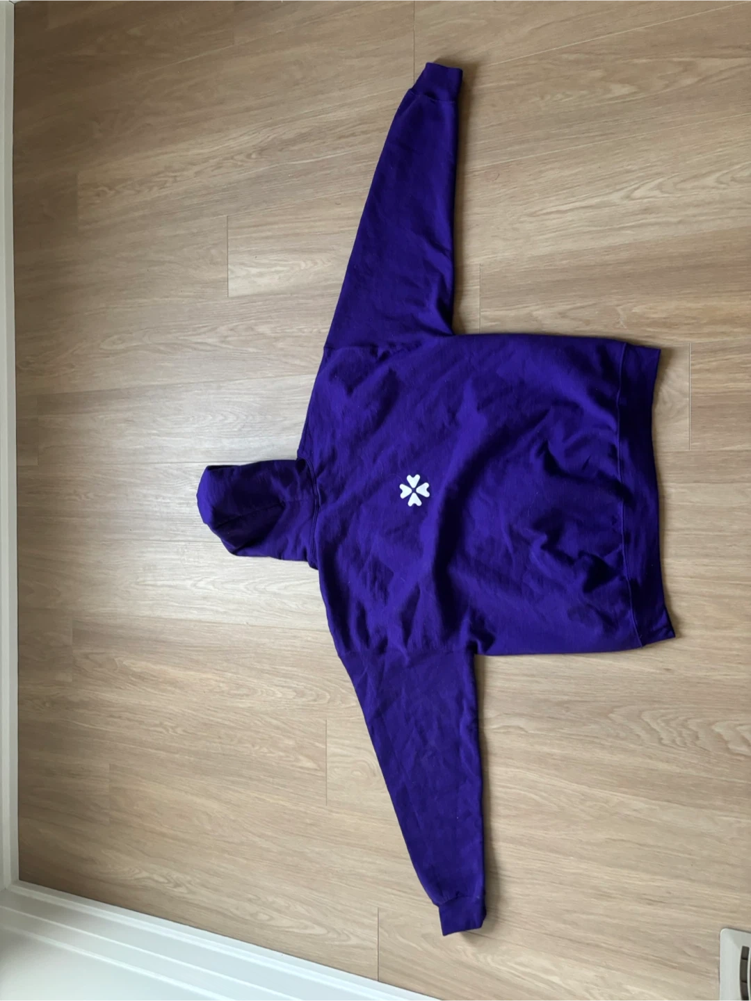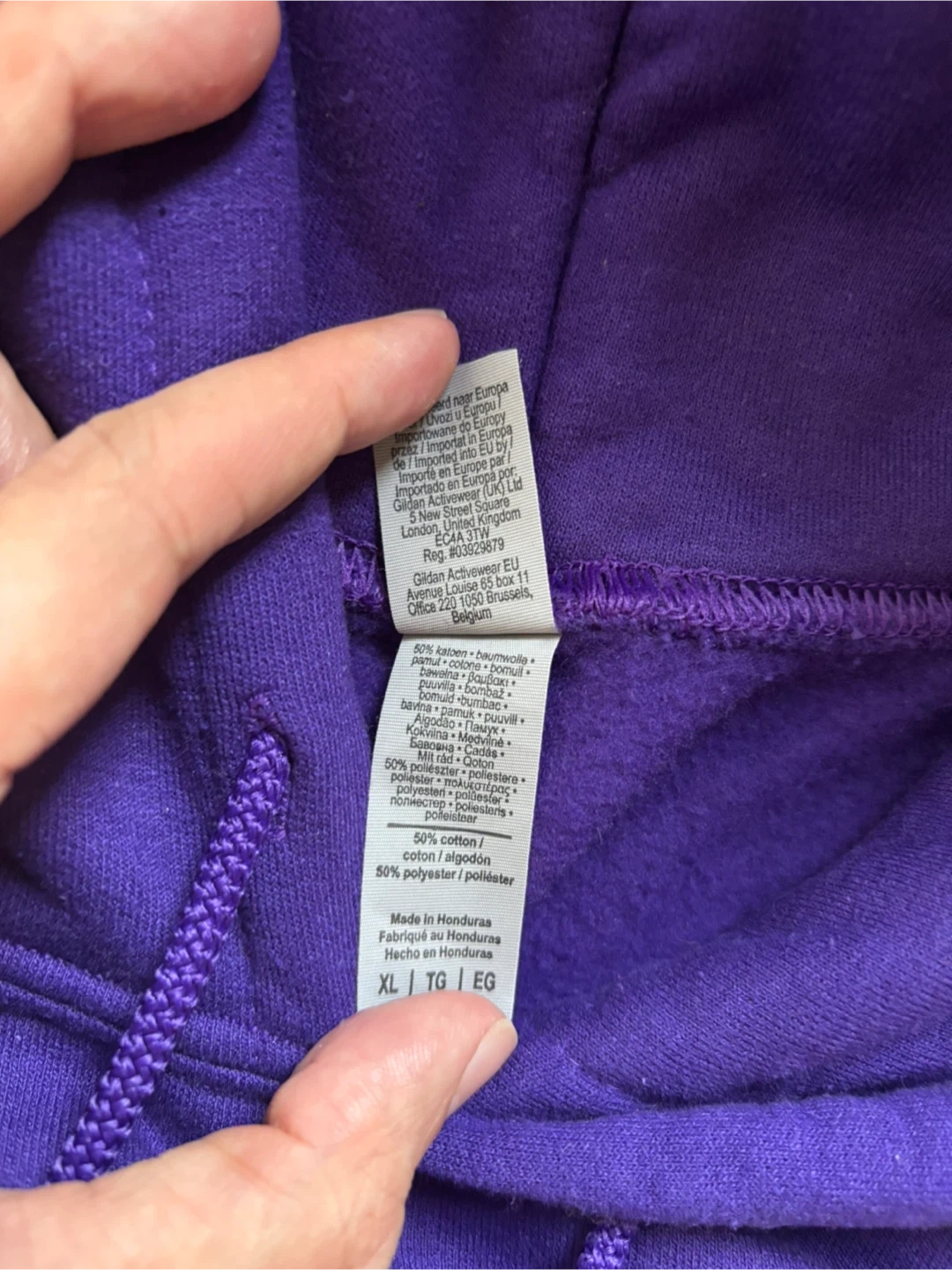 This Gildan purple hoodie is a size XL. It's made from a 50% cotton and 50% polyester blend. The hoodie features a graphic on the front with text reading 'OPENHEAVENS MUST HIGH GOD'.