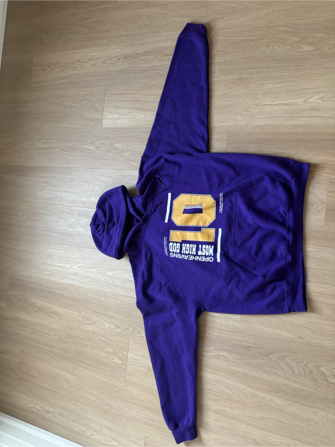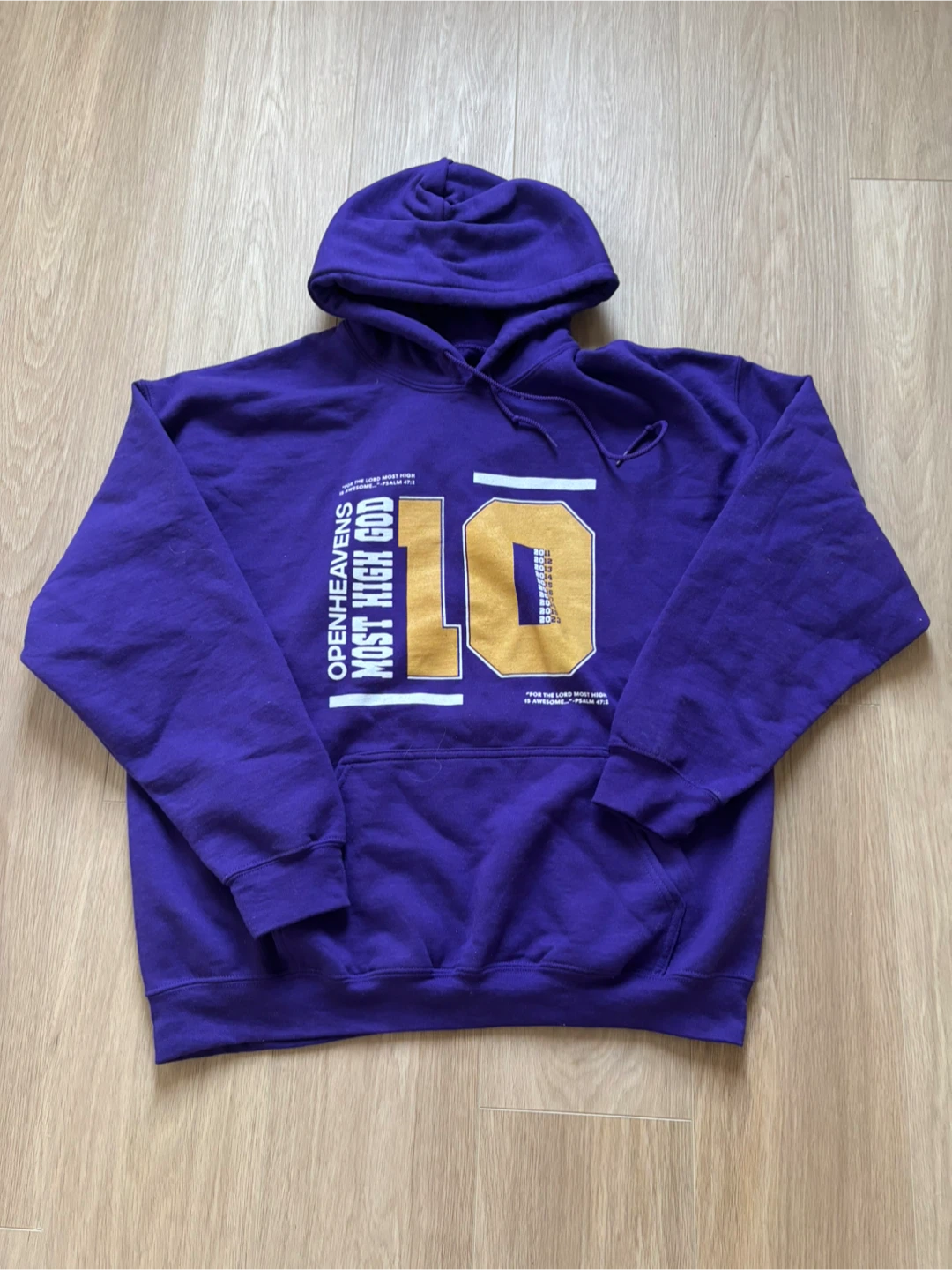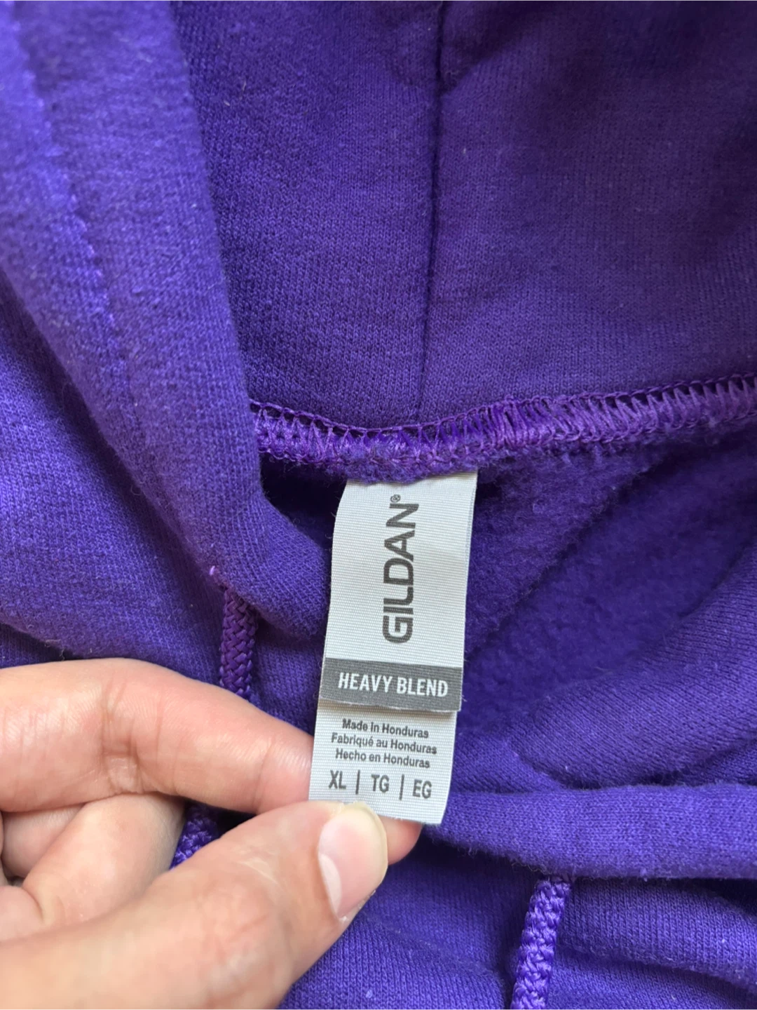 This Gildan purple hoodie is a size XL. It's made from a 50% cotton and 50% polyester blend. The hoodie features a graphic on the front with text reading 'OPENHEAVENS MUST HIGH GOD'.