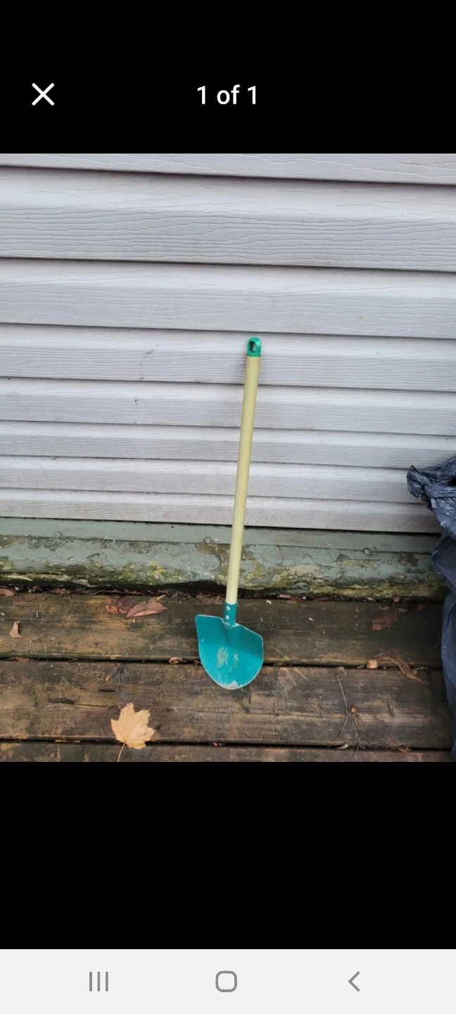 This is a child-sized shovel, perfect for digging in the garden or sandpit. It's made of durable plastic with a yellow handle and a teal scoop.