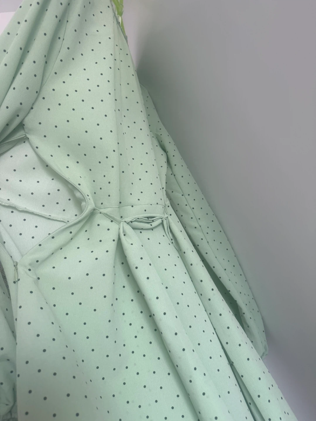 Selling a new Suzy dress in a lovely green colour with a polka dot pattern! It's a size medium and features a tie at the waist.