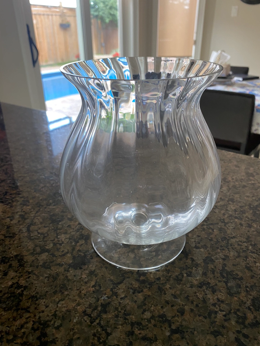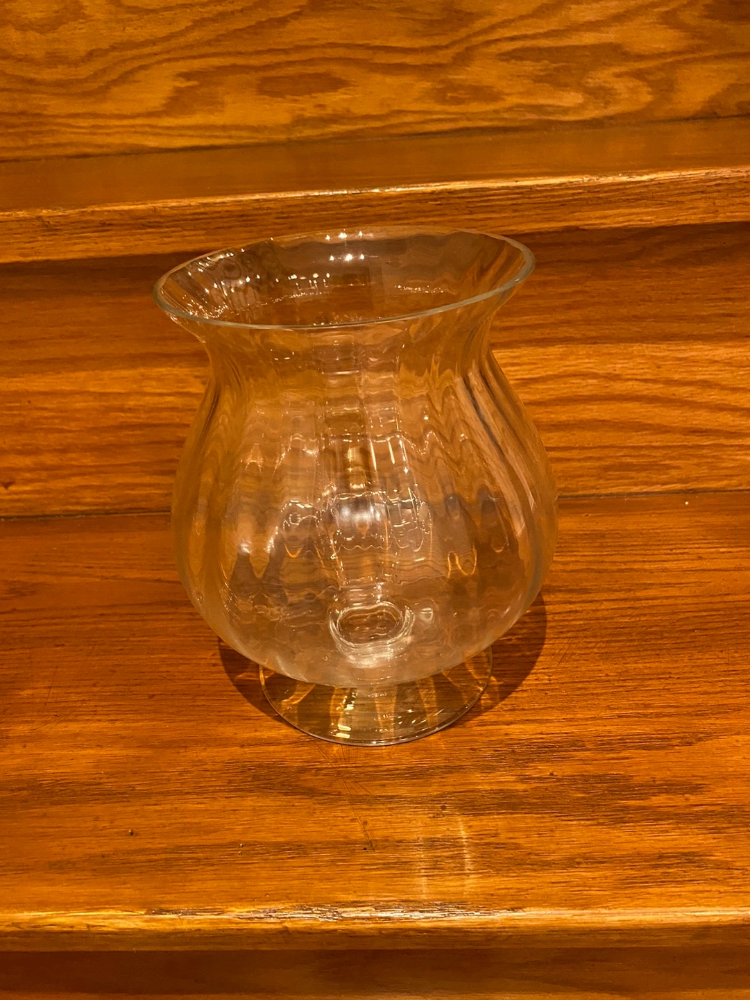 A clear pedestal glass vase with a flared top and a round base. The vase has a fluted design. It measures 7 inches tall.