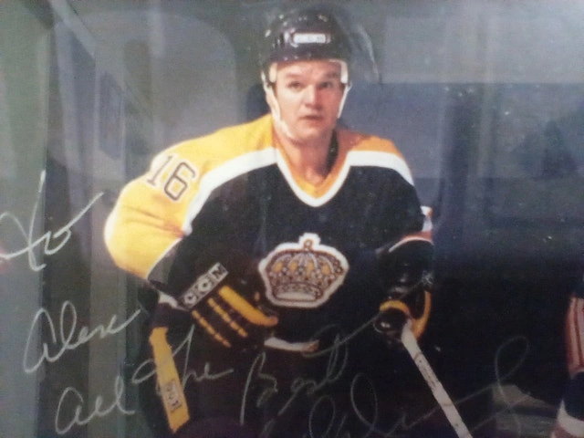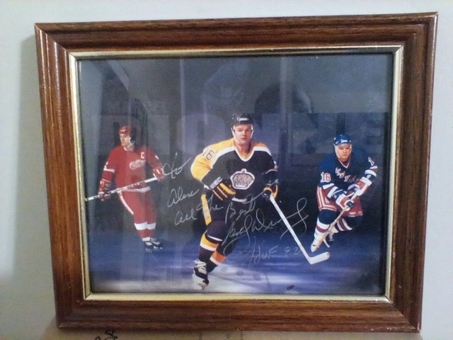 1992 Marcel Dionne H.O.F signed picture featuring three teams: Los Angeles Kings, Detroit Red Wings, and New York Rangers. The picture is in very good condition, though the frame is not. It's dedicated to someone named Alex. Please see pictures for details. Cash accepted.