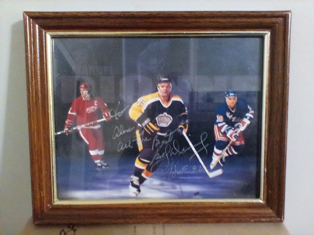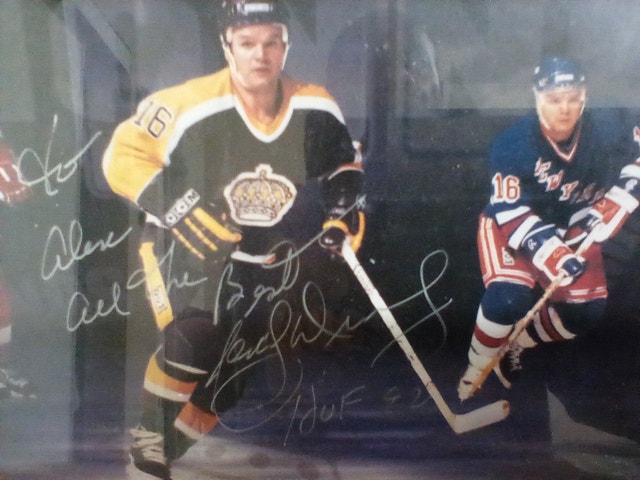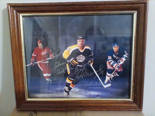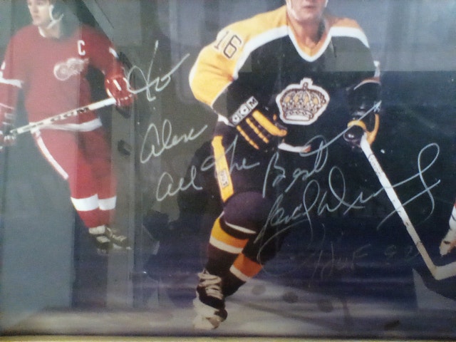 1992 Marcel Dionne H.O.F signed picture featuring three teams: Los Angeles Kings, Detroit Red Wings, and New York Rangers. The picture is in very good condition, though the frame is not. It's dedicated to someone named Alex. Please see pictures for details. Cash accepted.