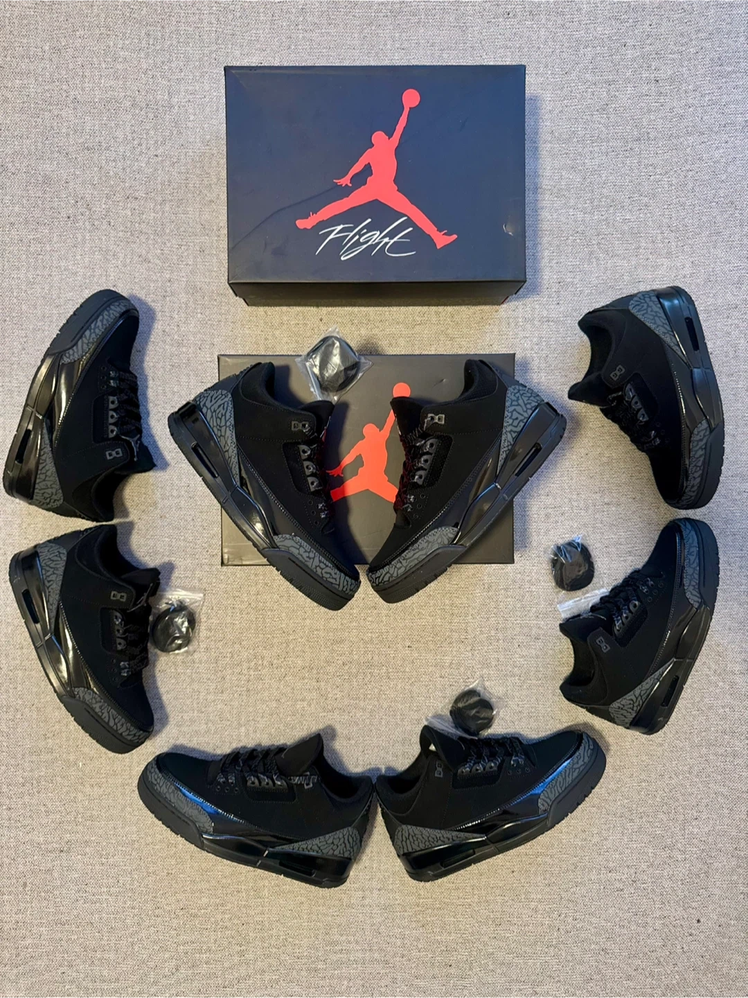 These are Air Jordan 3 Retro sneakers in the Black Cat colorway. They're made with a combination of leather and nubuck materials. The shoes include their original box and extra laces.