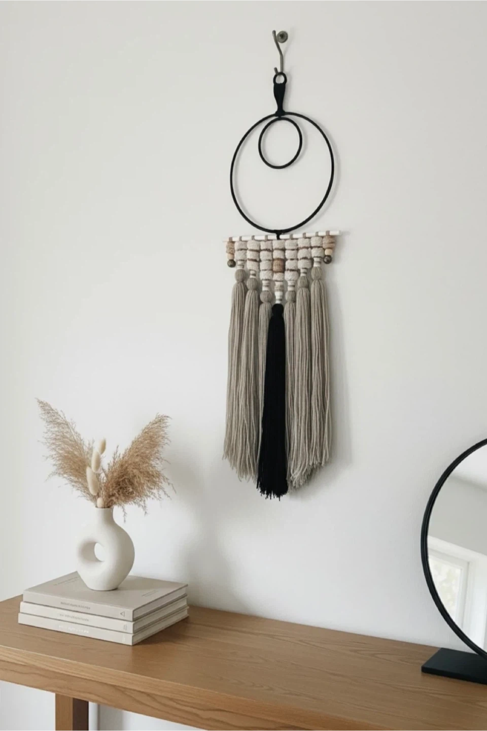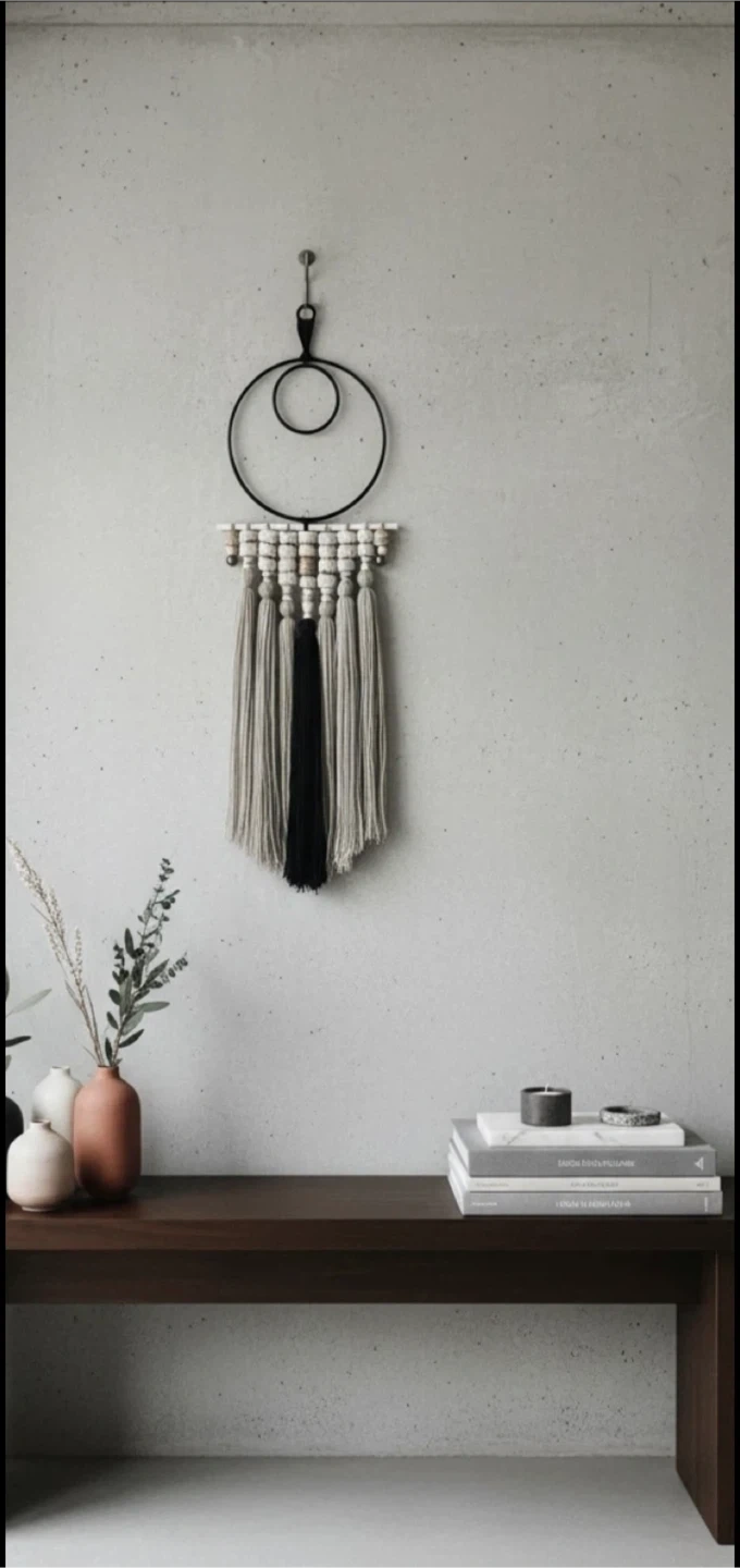 •Transform your space with the soothing presence of this Fiber Wall Hanging, a bold yet elegant fusion of minimal bohemian style and handcrafted fiber detail.