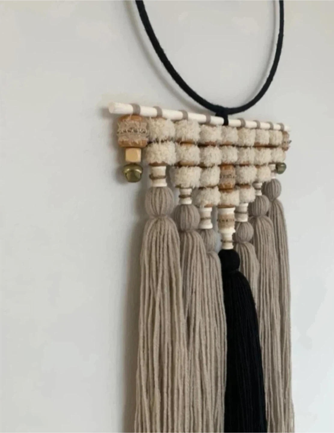 •Featuring a palette of neutral shades and hand-made wooden bead accents, this piece offers natural warmth and serene beauty. A lovely addition to any room.