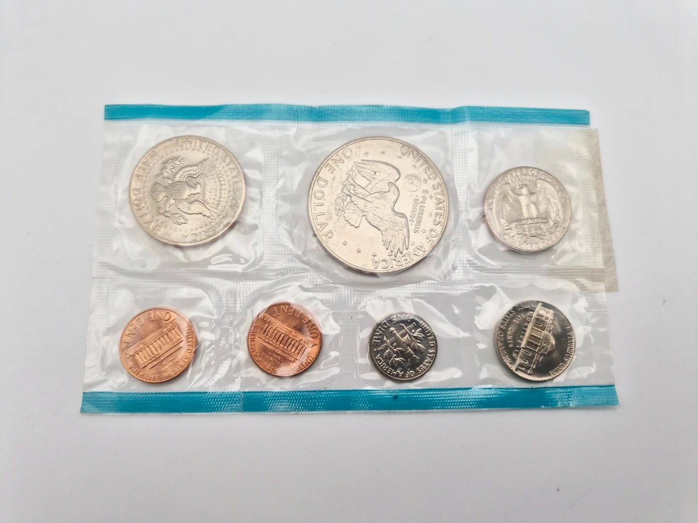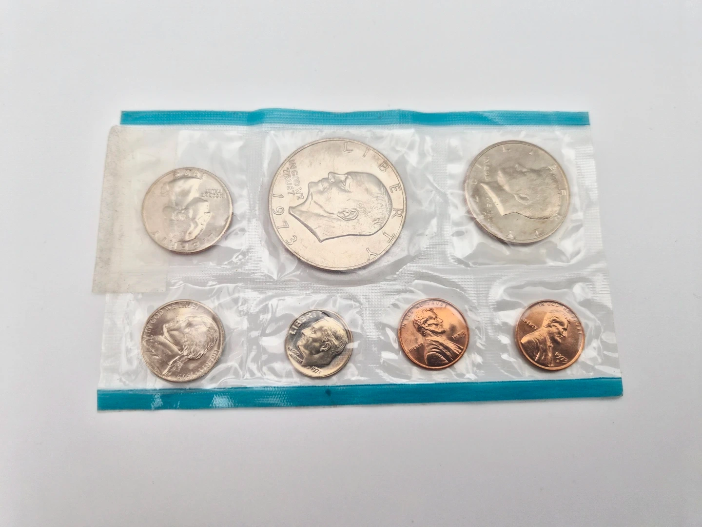 This is an uncirculated set of US 1973 coins, including pennies, dimes, quarters, and half dollars, all sealed in original packaging. The coins appear to be from the mid-20th century. It's a nice way to collect American currency!