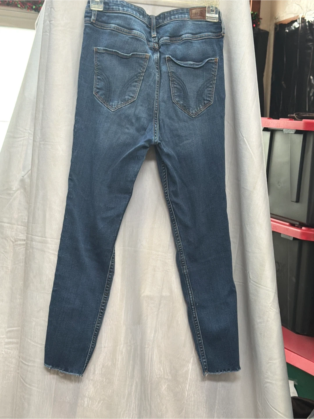 These Hollister jeans are a dark wash denim with distressed rips. They feature an ultra high-rise waist and a cropped, frayed hem. Size is 5S.