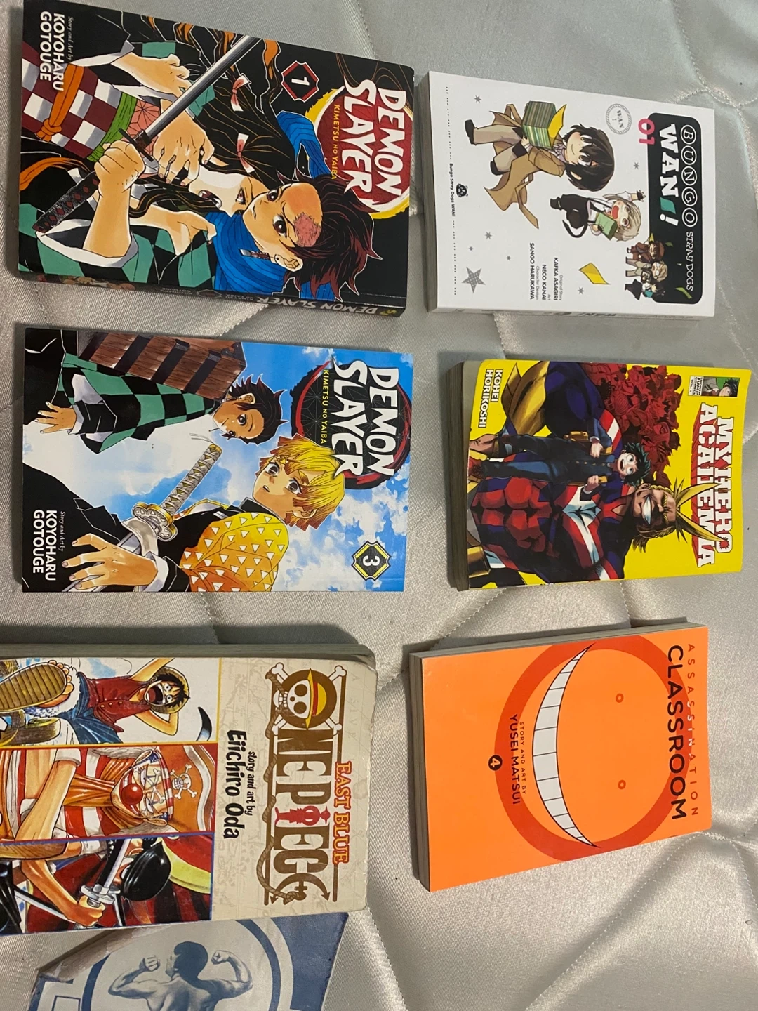 Bundle of popular manga series including Demon Slayer volumes 1 and 3, My Hero Academia, One Piece (East Blue), Assassination Classroom volume 4, and Bungo Stray Dogs WAN! 1. Great for fans of shonen anime and manga. These books are in good condition and ready for a new home.