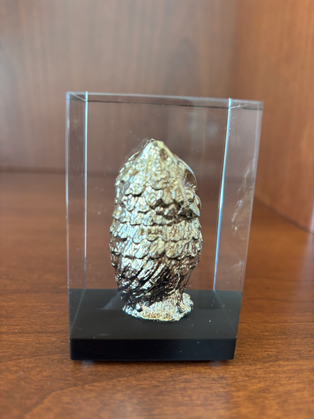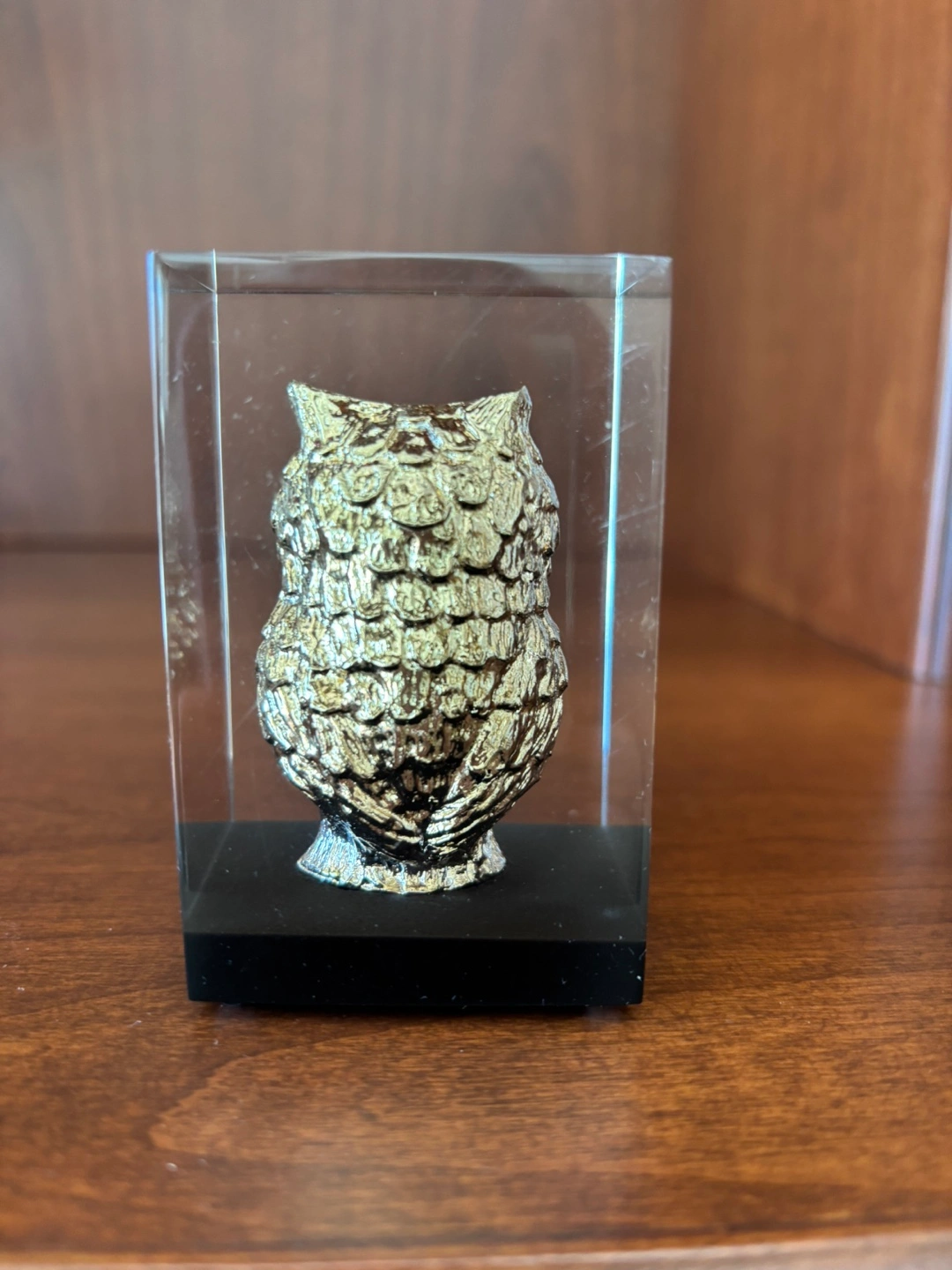 Vintage Paperweight of Gold Toned Owl Embedded in Lucite