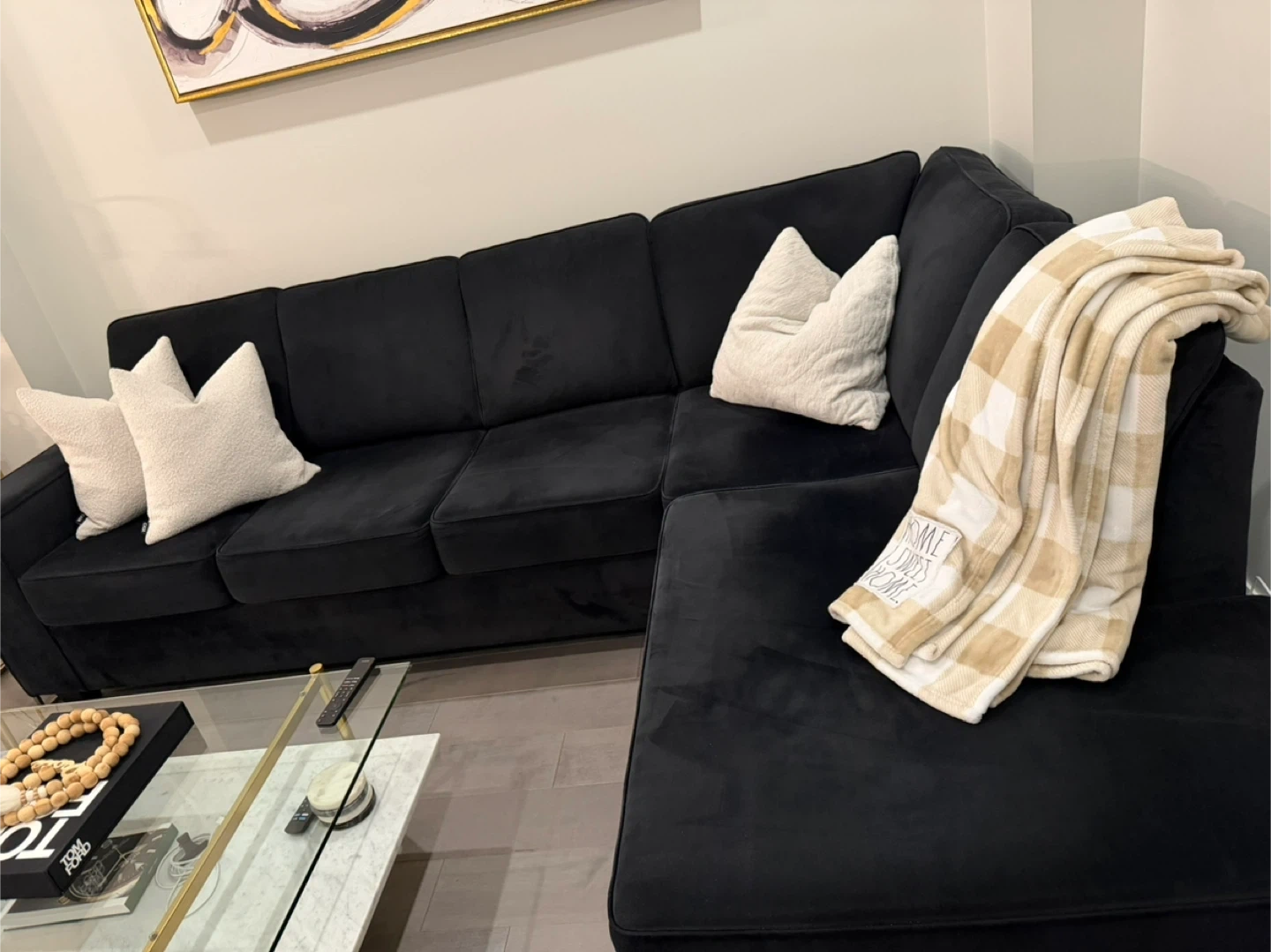 Black Velvet Sectional Sofa with Chaise