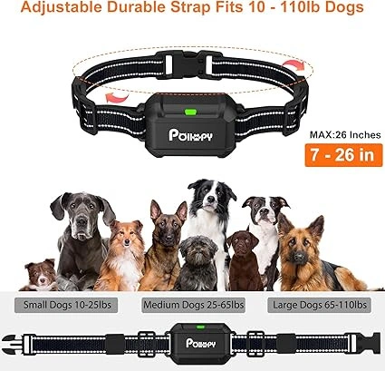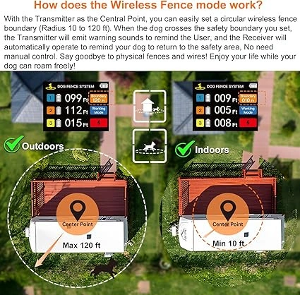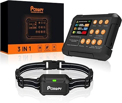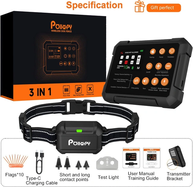 POIIOPY wireless dog fence system integrates 3 functions: ① Wireless Dog Fence ② Forbidden Zone ③ Remote Training Collar. Use the Dog Fence Mode to keep your dog in a specific safe area; Use the Forbidden Zone Mode to ban your dog from entering an area you set up to protect something; Use the Training Collar Mode to train your dog's behavior and stop unwanted habits. No need to dig or bury wires, and complete set up in 1 minute, so easy to use! Using the most advanced Radar Detection Technology, POIIOPY wireless dog fence is more accurate and the error can be lower than 2 Ft. As a result, it can eliminate false triggers and false warnings, and provide more reliable boundary control. Create a circular invisible boundary with the Transmitter as the central point (Adjustable radius from 10 to 120 Ft), suitable for Indoor and Outdoor areas. Effective & Humane Design: When the dog crosses the safety boundary you set, both the Transmitter and Receiver will continuously emit warning sounds at the same time, and then it will automatically operate to remind your dog to return or exit the safety area, no need manual control. So users can immediately discover abnormalities (pets escaping or entering the forbidden zone), and then do something to protect dogs and improve training effects. Small & Portable for Anywhere You Travel: The Transmitter's size is only 14x10x2cm, weight 220g, can be easily held in your hand or put in a pocket; The Receiver's size is only 7x4x3cm, weight 100g. The receiver is IPX7 waterproof and fits small, medium, and large dogs over 10 lbs. The durable adjustable strap fits neck sizes 7-26 inches (18 - 66cm). Both the receiver and transmitter have built-in Li-ion rechargeable batteries. After fully charged, they can work for 3-5 days and 10-12 days. Visual LCD Screen Monitor Interface: On the colorful LCD screen, you can clearly see the distance change in real time between each dog and the transmitter, see the remaining power of each receiver and transmitter, and see the intensity level of the vibration and electric shock functions you set. Independent large buttons, one-button switching between 3 modes, easy to operate and use. One transmitter can be connected to up to 3 receivers at the same time to train 3 dogs. Three Training Modes: (1). In the Wireless Dog Fence mode or the Forbidden Zone mode, it has 2 training modes: Beep + Vibration; and Beep + Vibration + Static Shock, their intensity will gradually increase from level 1 to level 6 automatically (can not adjust the intensity manually). (2). In the Dog Training Collar mode, it has 3 adjustable training modes: Beep (only 1 level), Vibration (levels 0-8), and Safety Static Shock (levels 0-16). Its remote range is up to 330 Yards. Notes: (1). For best performance, please place the transmitter on a wall or table higher than 3 Ft (1 meter), and keep away from dogs to avoid dog chewing. (2). Before using Wireless Dog Fence mode to set boundary, we recommend using the test mode to determine the signal and distance. (3). Train your dog with the wireless dog fence before normal use it with no supervision