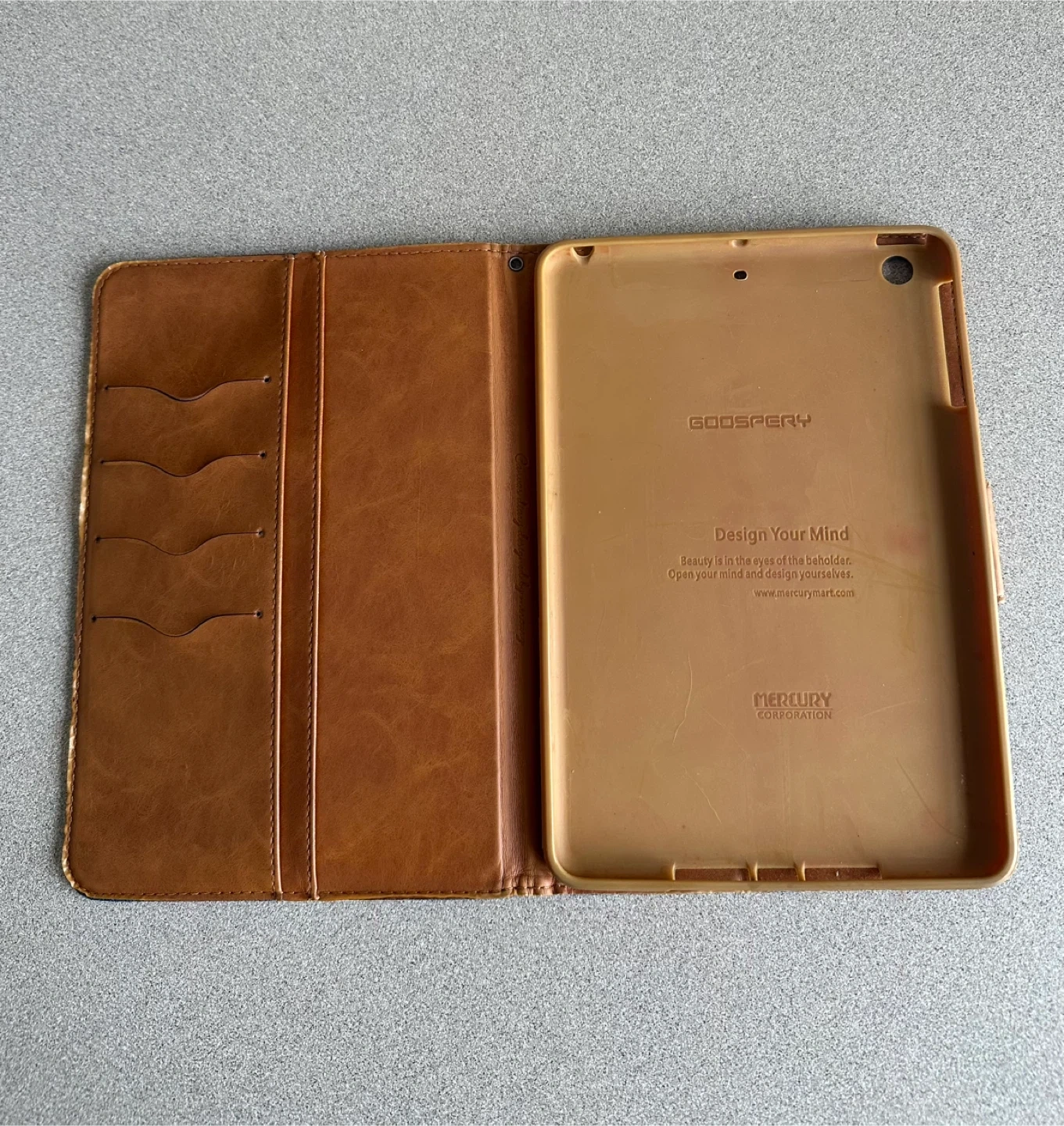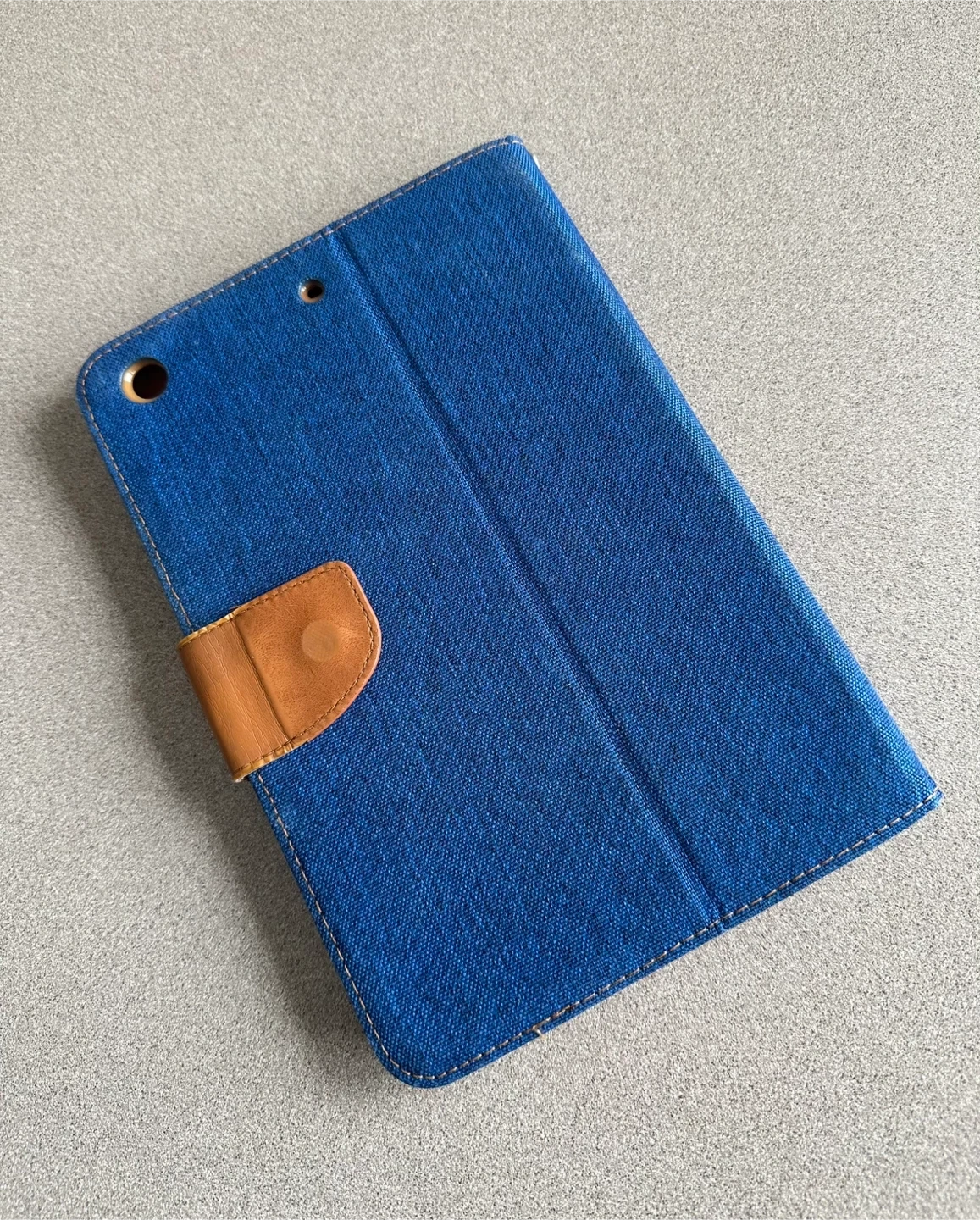 This Gootery tablet case comes in a stylish blue denim finish with brown faux leather accents. It features convenient card slots inside the flap for easy access. Protect your tablet with this durable and fashionable case!