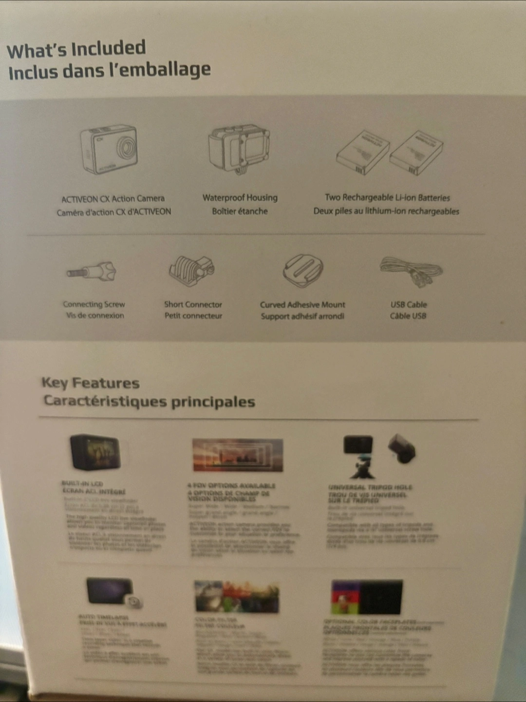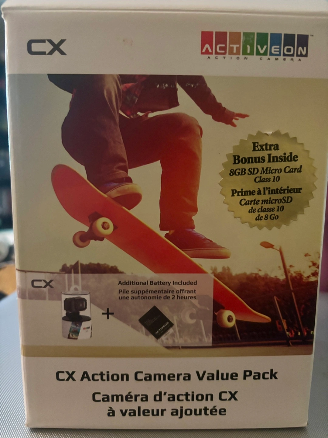 I'm selling an ACTIVEON CX action camera value pack, brand new in its original packaging! This action camera is perfect for capturing all your adventures with its Full HD 1080p recording, built-in Wi-Fi, and waterproof design. It comes with an extra battery and an 8GB SD micro card, ready for immediate use.