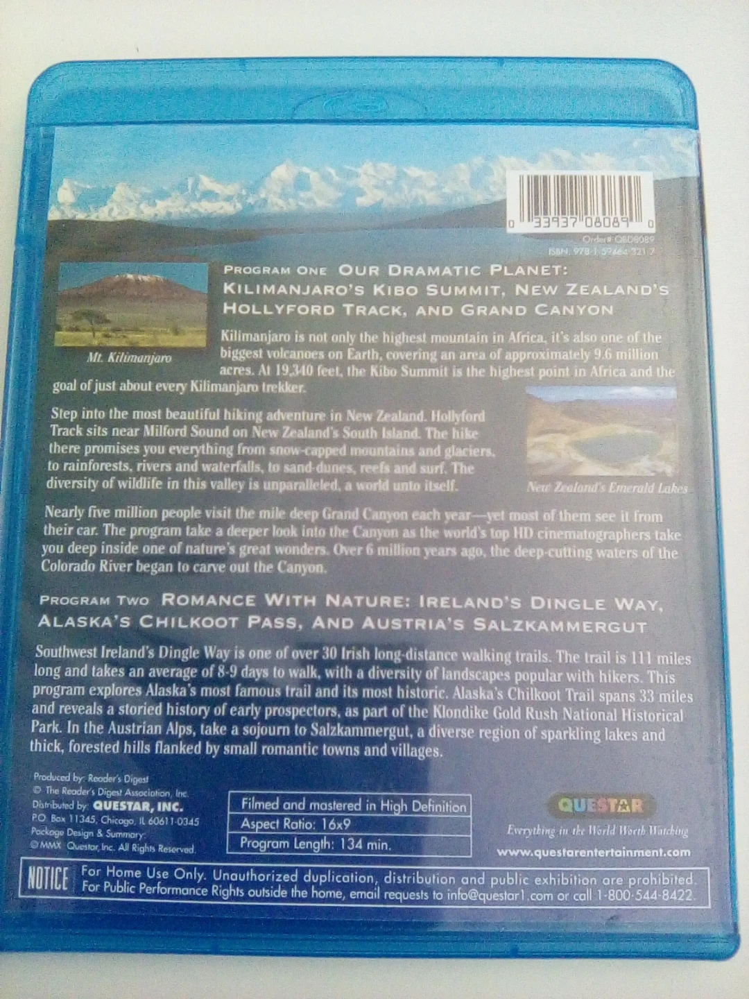 This Blu-ray disc features two programs: 'Our Dramatic Planet' exploring Kilimanjaro, New Zealand, and the Grand Canyon, and 'Romance with Nature' covering Ireland and Alaska. It includes nearly five million people's favourite walks. Aspect Ratio: 16x9. Program Length: 134 min.