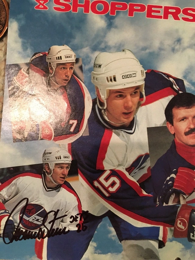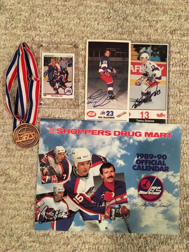 Own a piece of Winnipeg Jets history with this collection of memorabilia! Included is a 1989-90 Shoppers Drug Mart official calendar signed by Thomas Steen, perfect for the vintage collector. You'll also get a Paul MacDermid signed card, Teemu Selanne signed card, Randy Carlisle signed card in acrylic case, and a Winnipeg Jets medallion from the Jets Wives Carnival. This set is ideal for any die-hard Jets fan looking to add to their collection. If the ad is up, it's available! Please see my other ads!