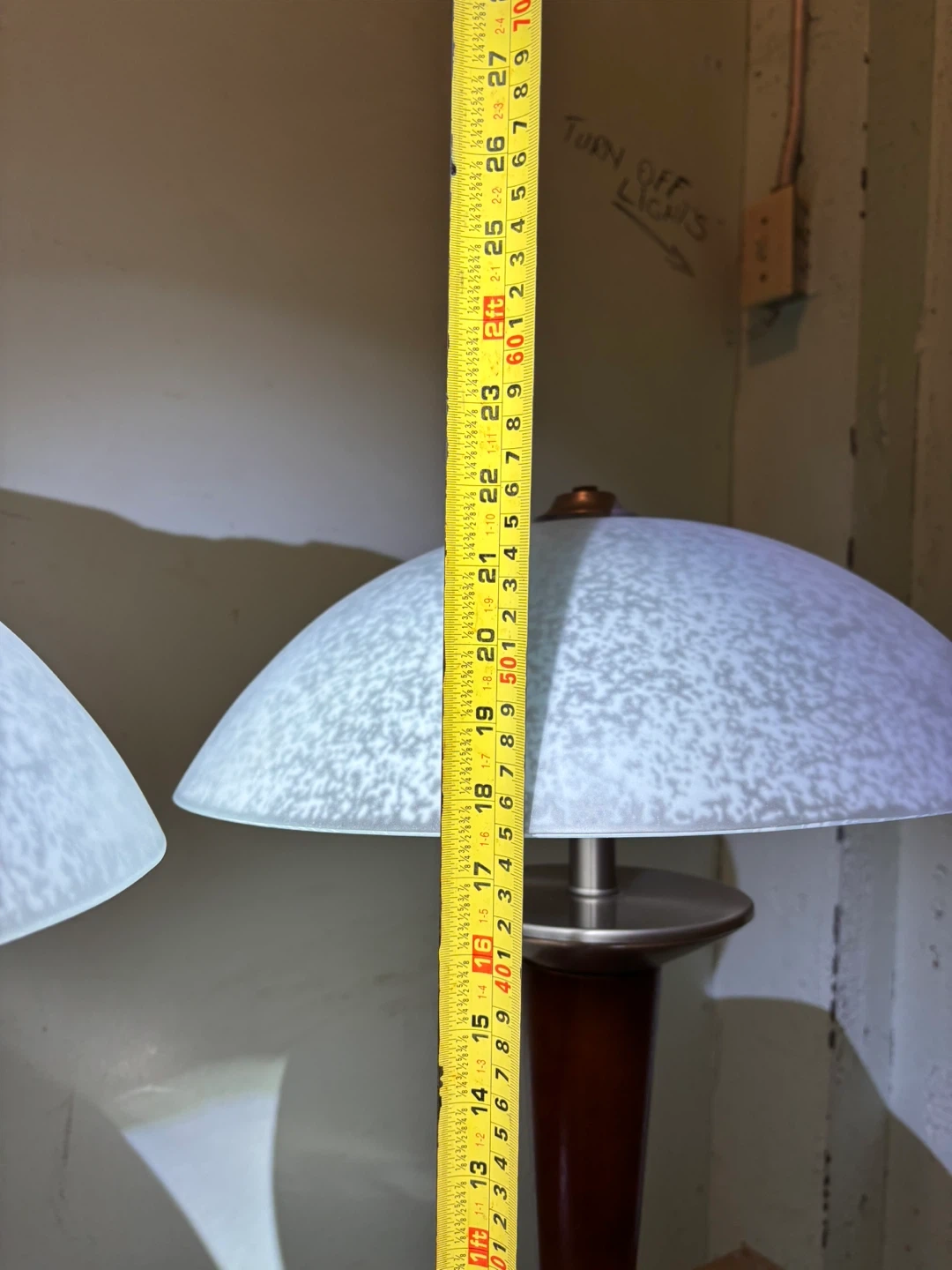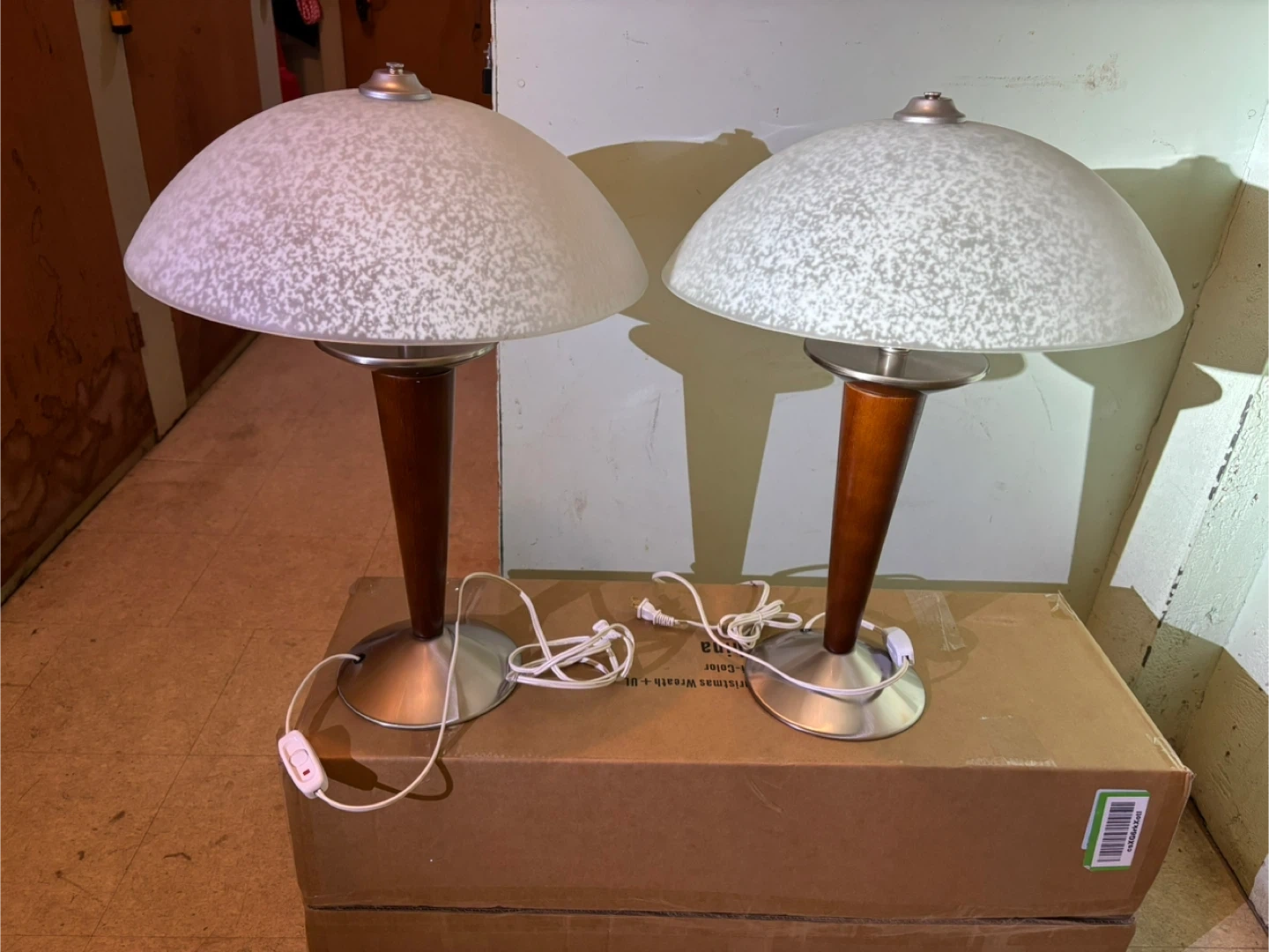 This pair of table lamps features frosted glass shades and a wood and metal base. They're about 23 inches tall. They would look nice on side tables or nightstands.