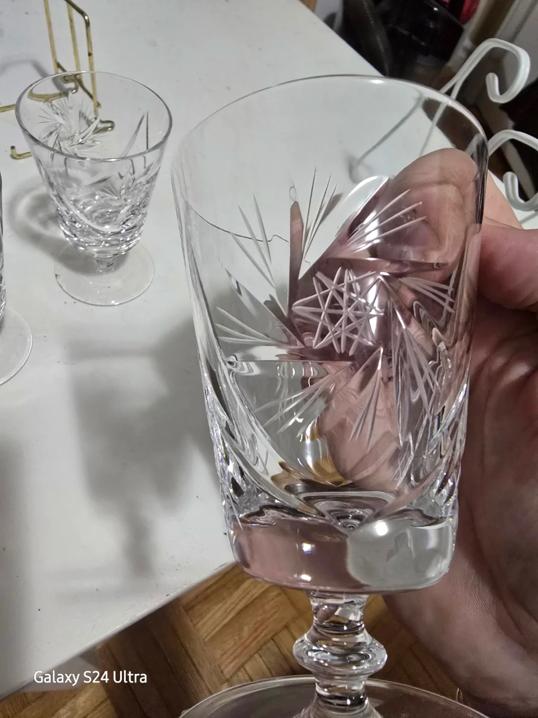 Set of elegant crystal glasses featuring a detailed cut glass pattern. These glasses add a touch of sparkle to any table setting. Perfect for enjoying your favourite beverages during special occasions! Pinwheel pattern