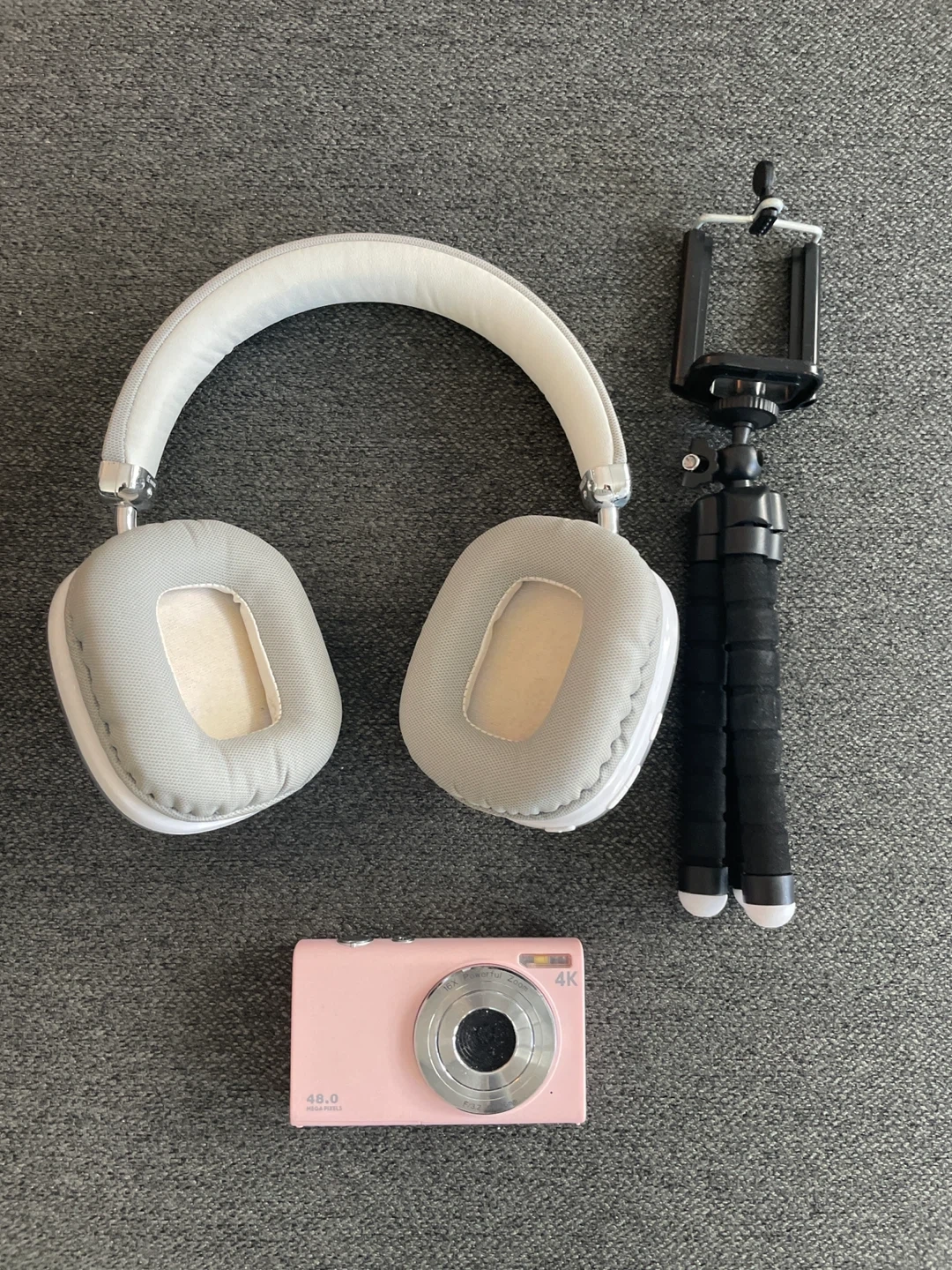 Compact pink digital camera. A small tripod for stable shots is included. And a grey headphone. This camera is great for capturing everyday moments or vlogging!