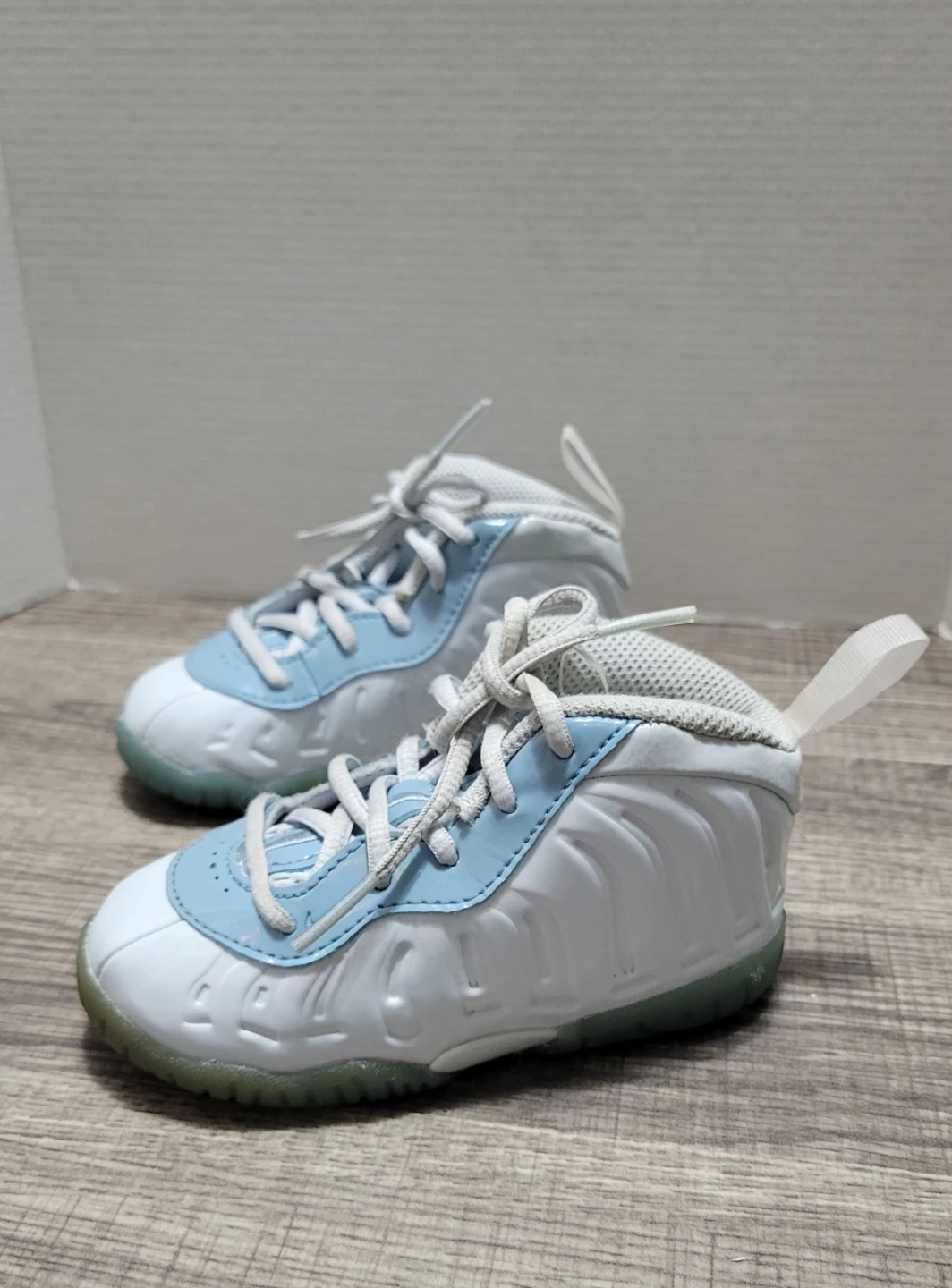 Toddler Nike Little Posite One sneakers. White with light blue accents. Size 6C.