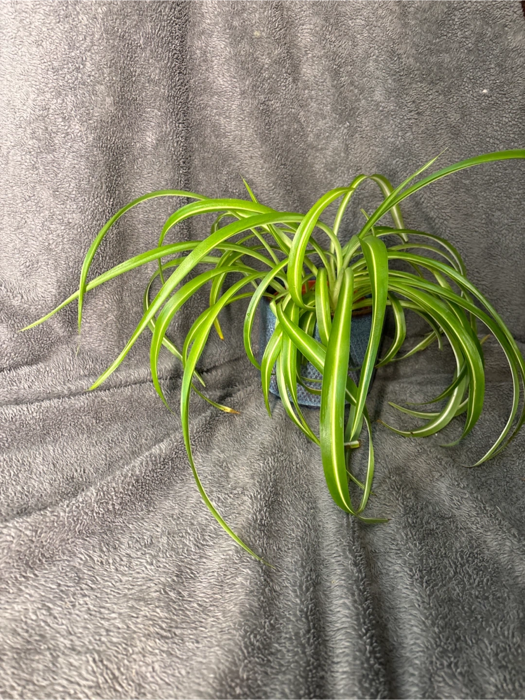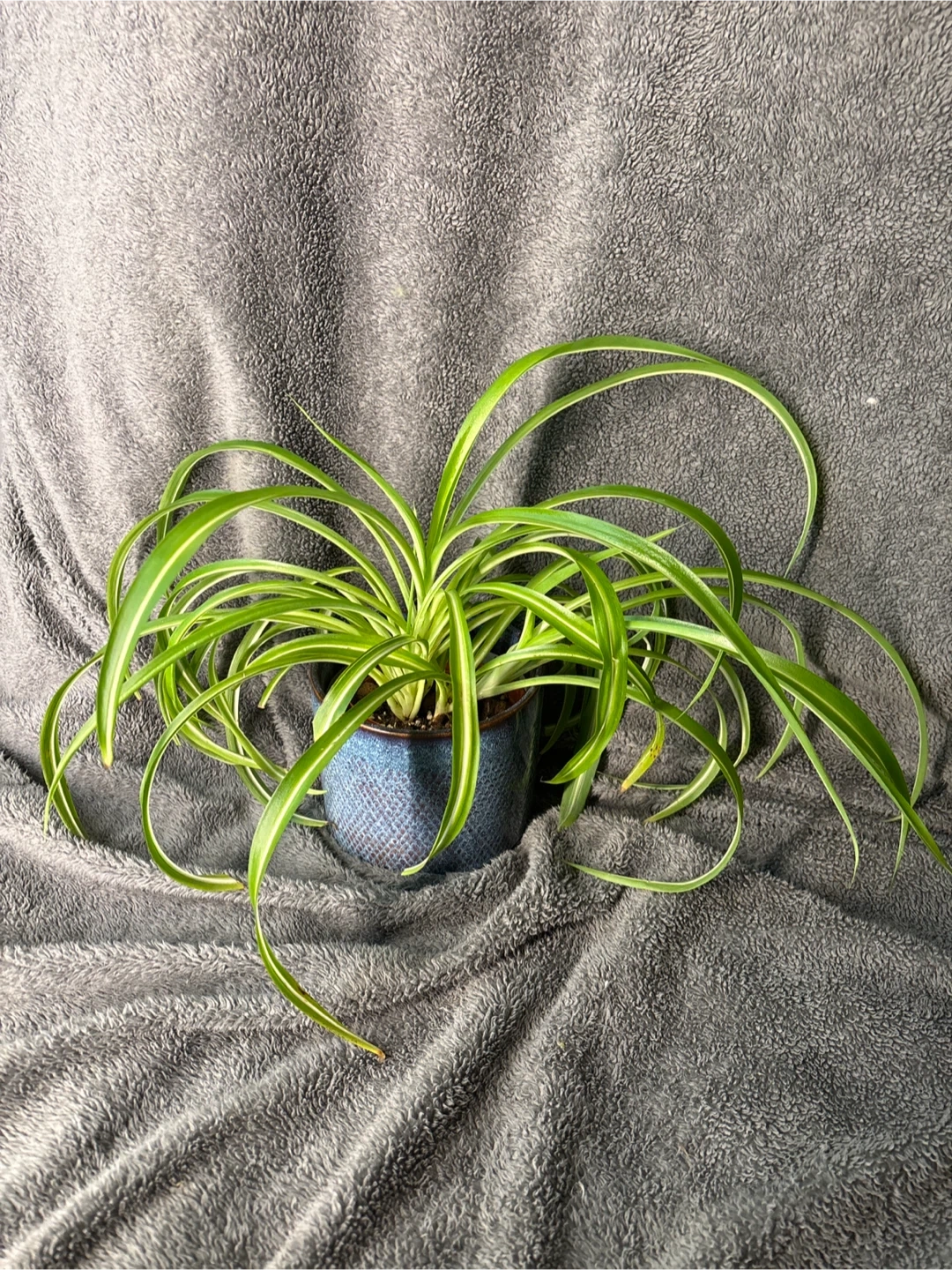 Healthy spider plant with long, arching leaves. Comes in a textured blue ceramic pot. Great for adding a touch of green to any space!