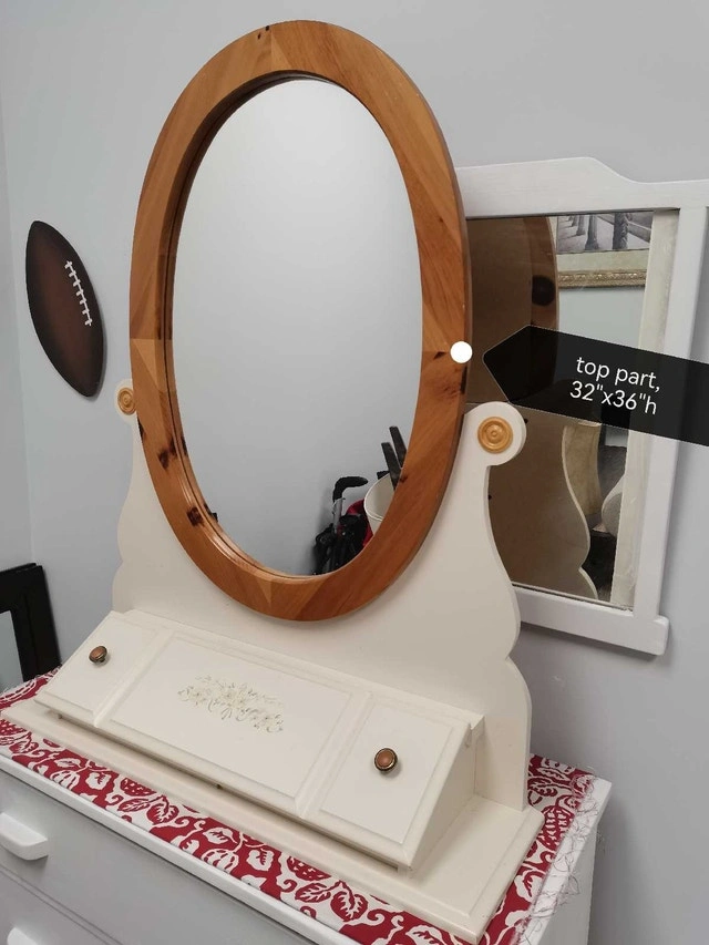 This is a charming vanity mirror with a wooden frame, perfect for adding a touch of elegance to any bedroom or dressing area. The mirror is in good condition, ready to be the spotlight of your morning routine. It features a storage compartment beneath the mirror. size shown it's time for this beauty to find a new home. If the ad is up, the vanity mirror is available, so don't hesitate to reach out!