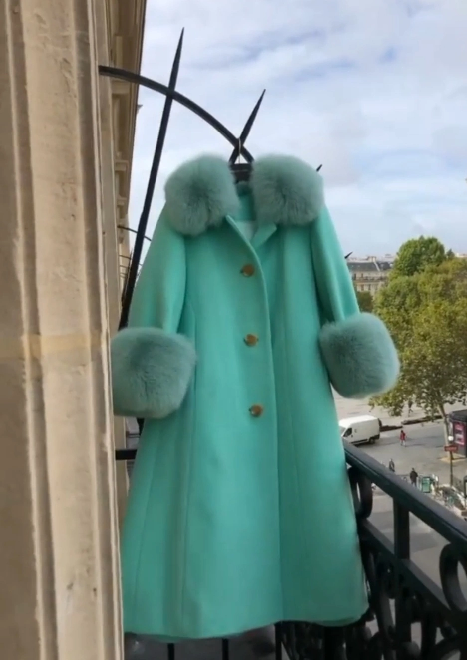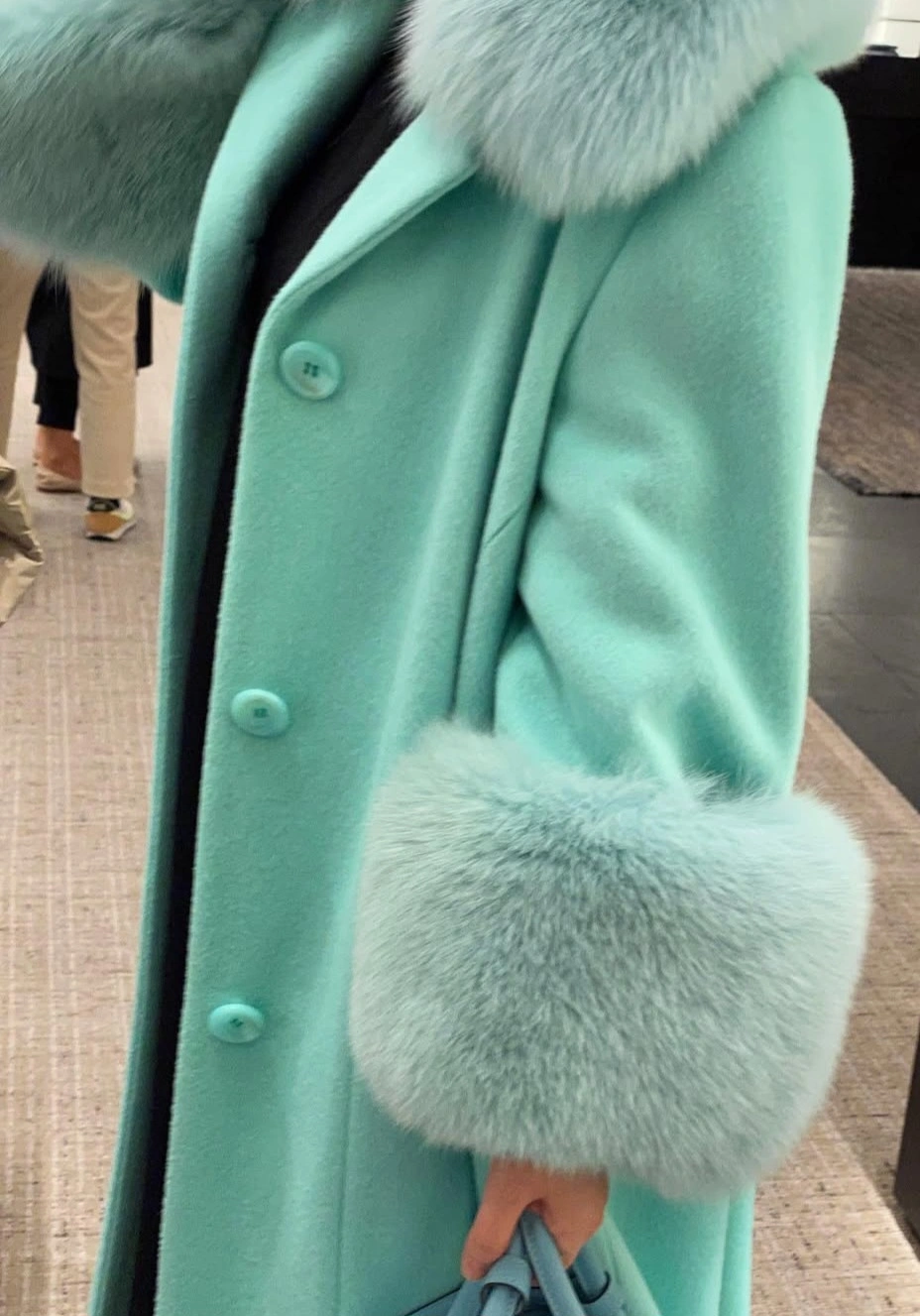 Mint Green Wool -Blend Coat with Genuine Saga Fox Fur