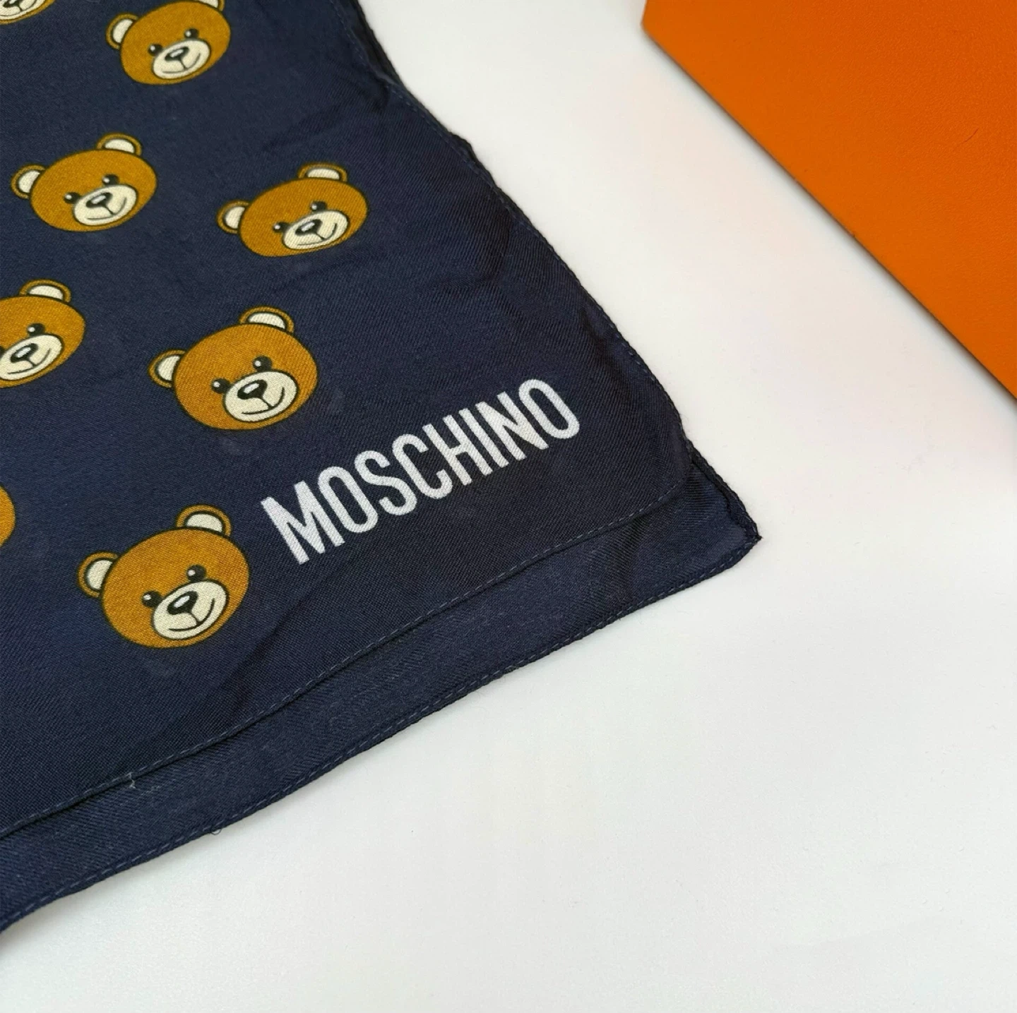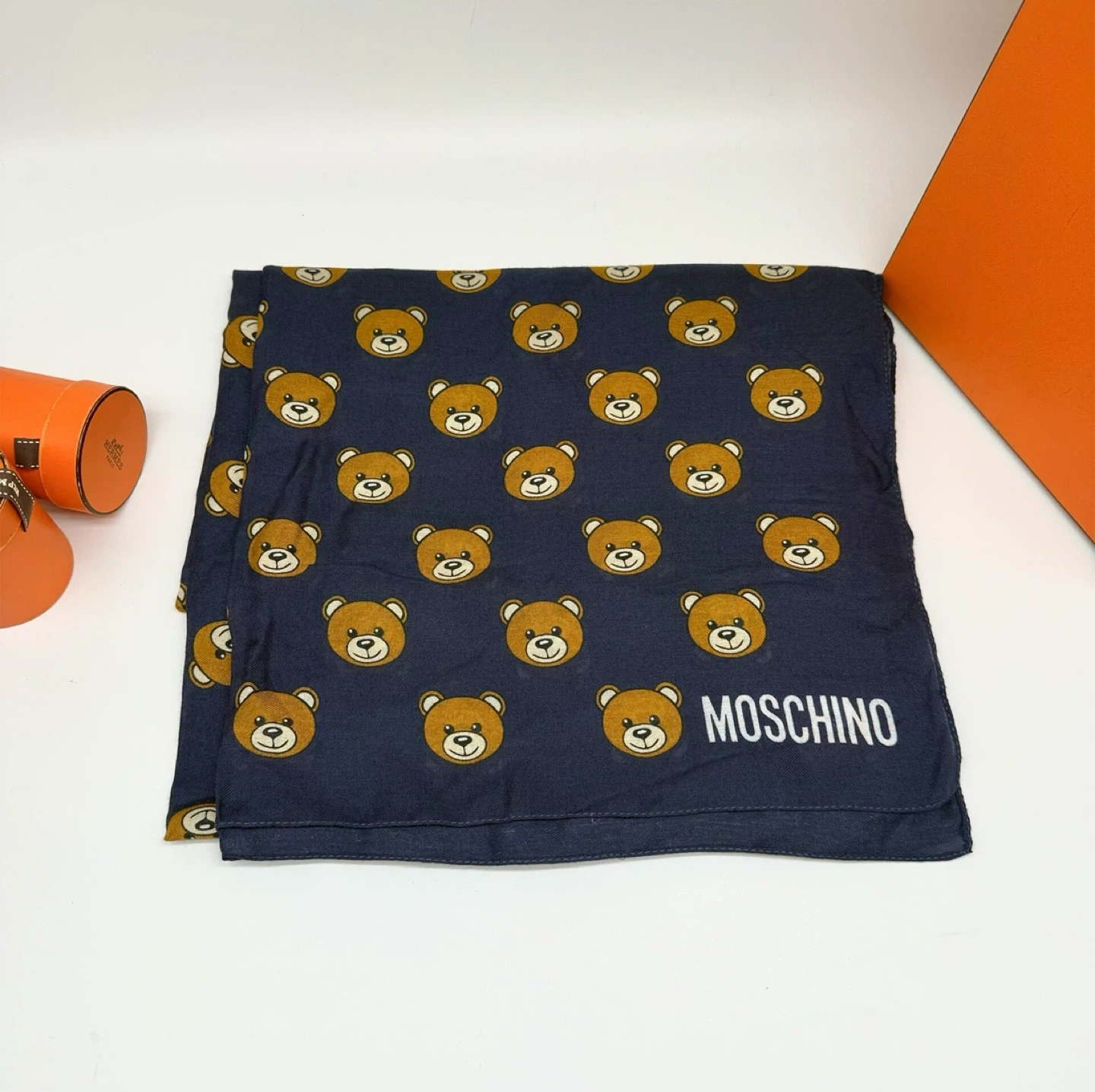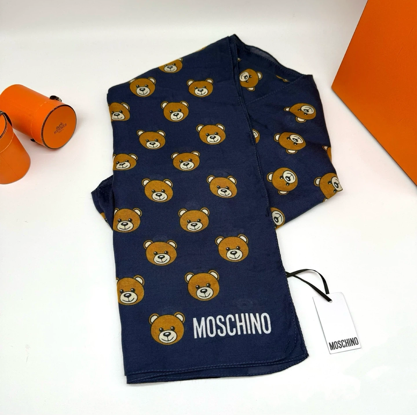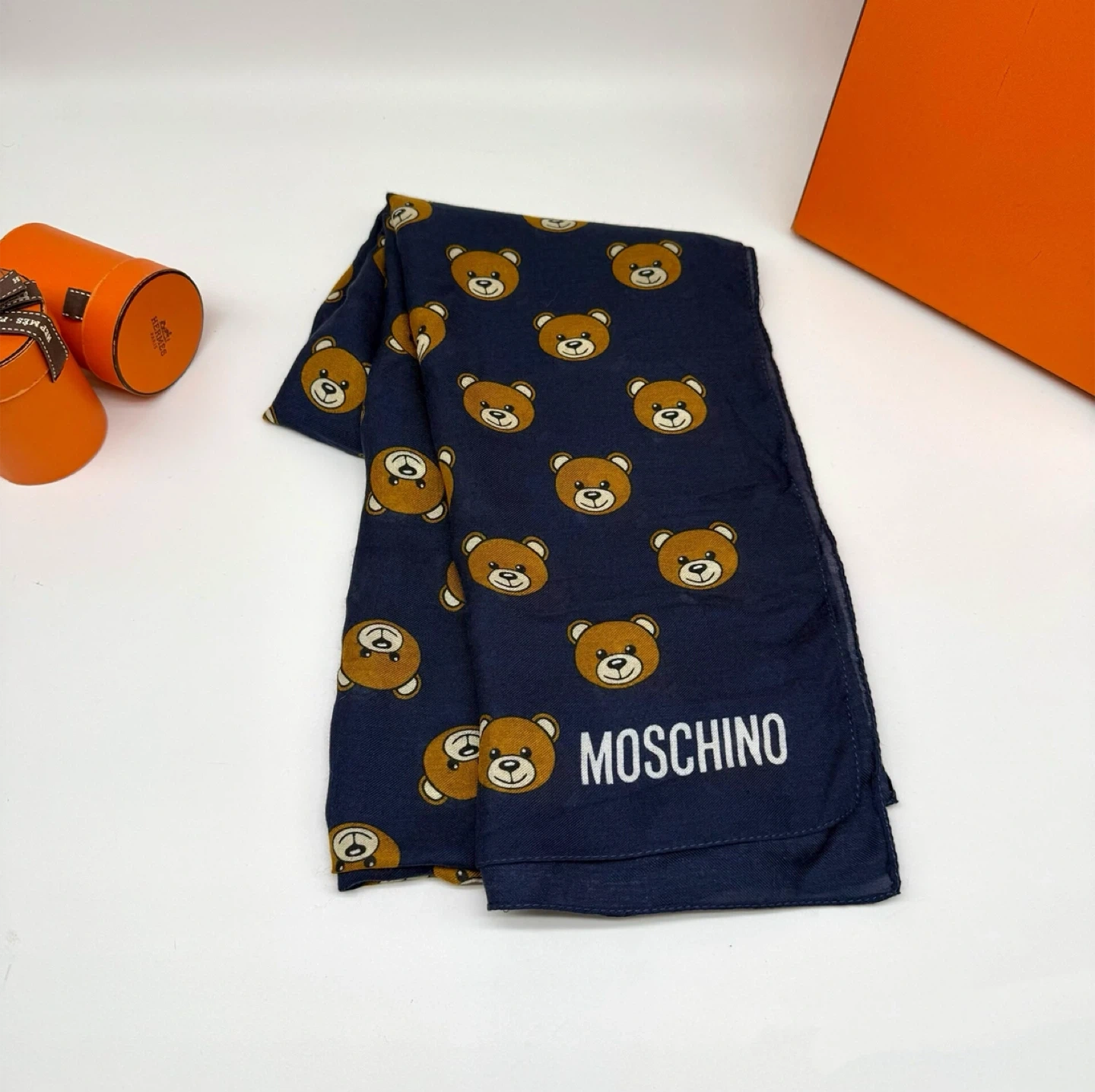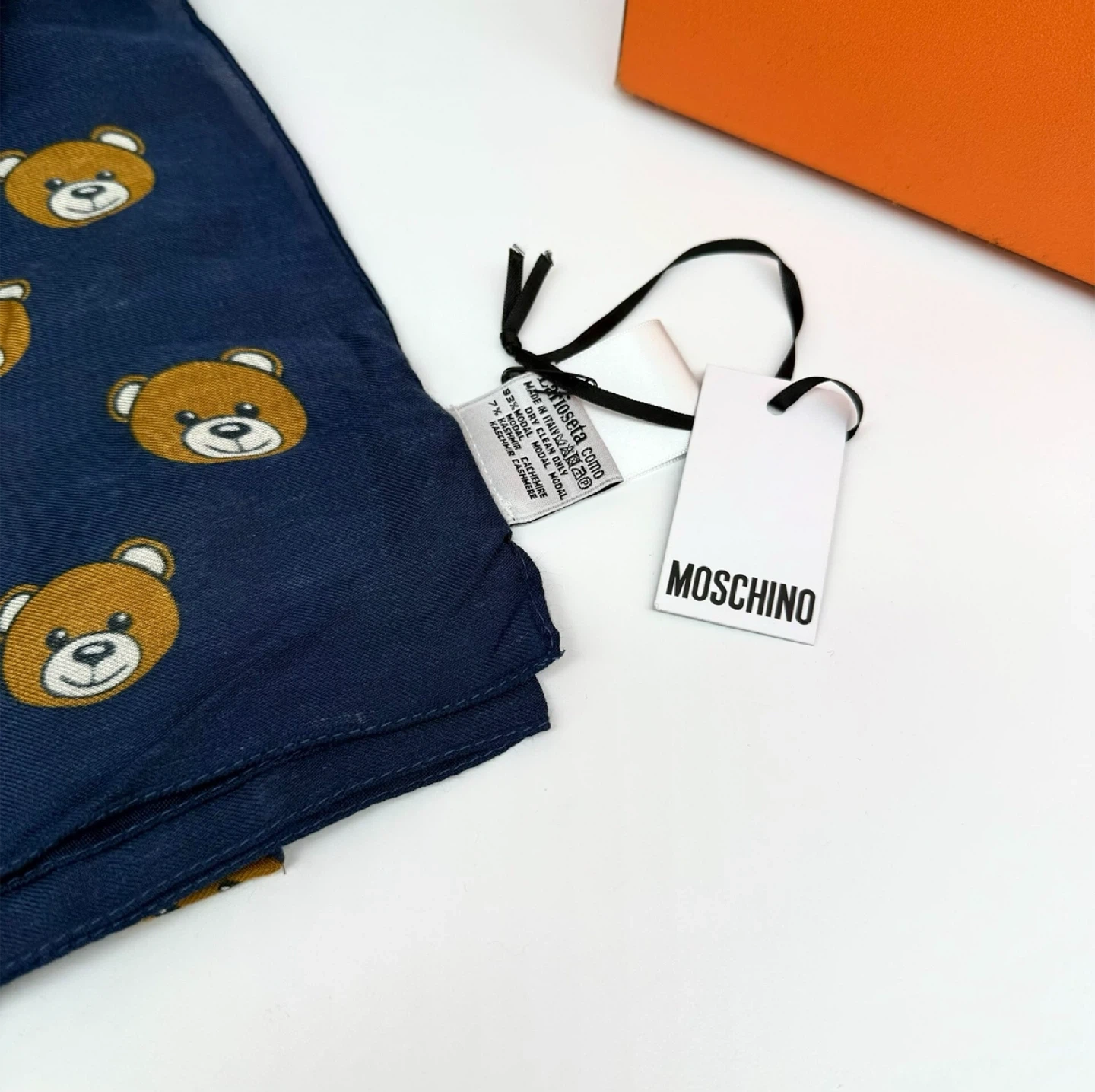Check out this brand new Moschino scarf! It's a beautiful navy colour with an adorable teddy bear print. The material is 92% modal and 8% cashmere, making it super soft and cozy. Perfect for adding a touch of luxury to any outfit