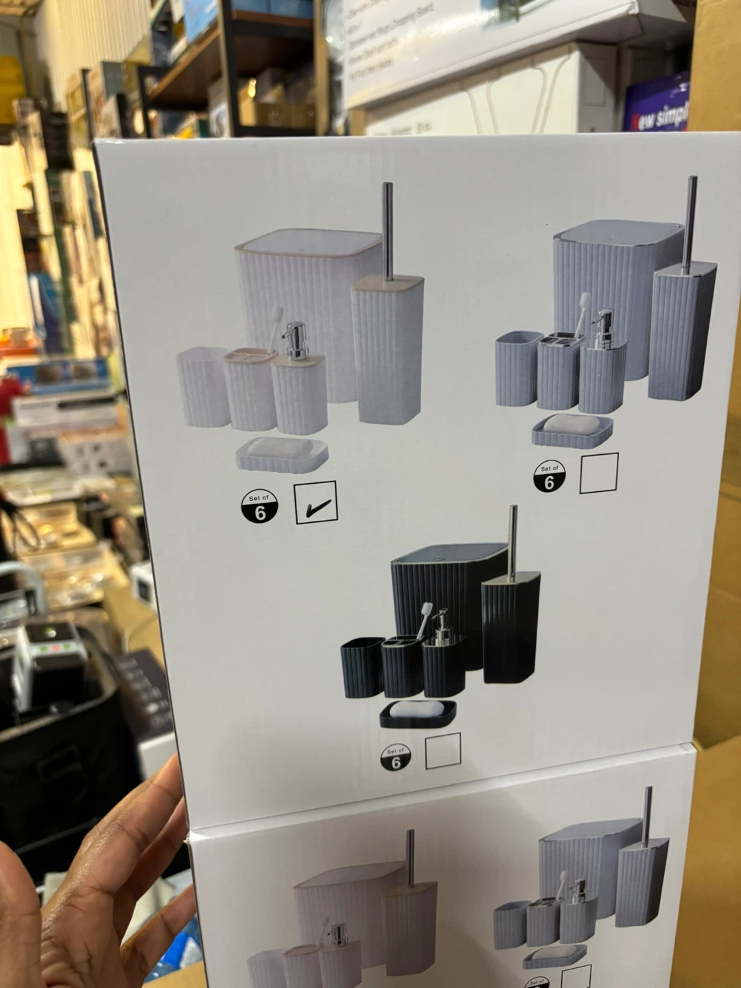 Complete 6-piece bathroom accessory set in white. Includes a trash bin, toilet brush with holder, soap dispenser, toothbrush holder, and soap dish. Made from durable plastic.