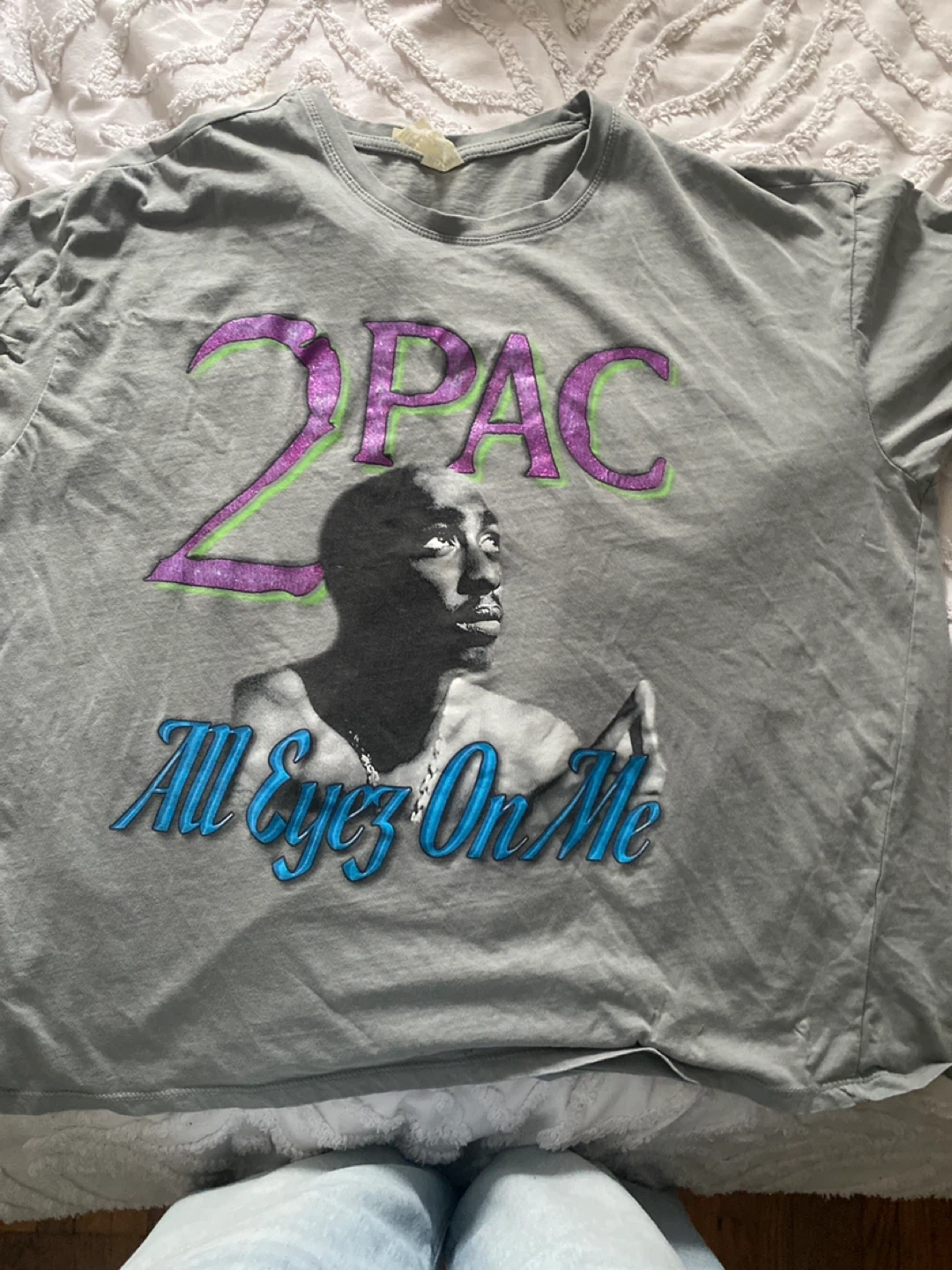 Grey t-shirt featuring a graphic of 2Pac with 'All Eyez On Me' text. Cotton blend material. Great for fans of 90s hip-hop!