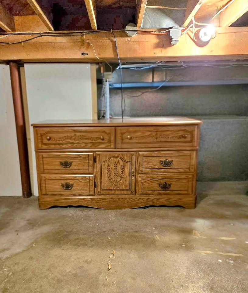 Classic wood dresser with a nice medium oak finish. Features six drawers and a center cabinet with a cool carved design. Ornate metal pulls on all drawers and cabinet. Good for bedroom storage or extra space anywhere.